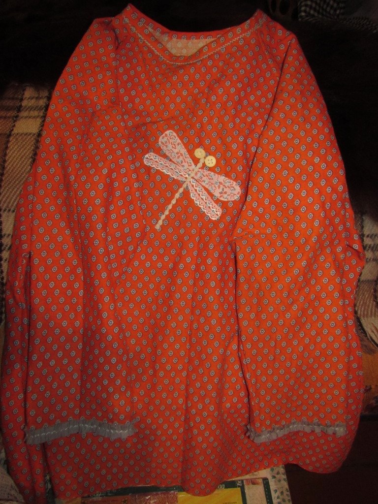 @Sew kaif , в теме нет про обвязку, но теперь будет :) Нужен тонкий крючок (0,5): Рабочая нить перекинута через указательный палец и натянута: Втыкаем крючок в ткань, цепляем рабочую нить и вытягиваем петлю: На крючке 2 петли. Цепляем нить и протягиваем через обе петли на крючке. Столбик готов: Дальше повторяем то же самое. Когда довязали до конца, цепляем нить, протягиваем через петлю на крючке, вытягиваем побольше и обрезаем: Оставшийся кончик вдеваем в иголку и затаиваем в шве: Если швы размахрились, перед обвязкой их надо подрезать. Начинать точно так же, тоже оставить кончик подлиннее, чтобы удобнее было затаить. Девушки, прошу помощи зала :) Сделала я свою рубашку со стрекозкой. Мелкий узор на самом деле белый, но из-за большого числа тёмно-серых линий выглядит серым даже с небольшого расстояния. Поэтому горловину я пришила не белыми, как задумывала, а серыми нитками: И мне очень понравилось :) И захотелось ещё куда-нибудь серого добавить. Думала-думала и решила пришить по краю рукавов рюшку: И вроде она лишняя, а вроде и нет. Что-то не то. Отпороть или оставить? Когда заворачивала, чтобы показать вам без рюшки, рукав подвернулся вот так: Мне кажется, этот вариант лучше всего - просто пришить точечным прямо сверху и всё :) Без ничего как-то пустовато: Или оставить широкую рюшку? Как вам больше нравится? Широкая, узкая или вообще без неё? Заранее спасибо!1 балл -