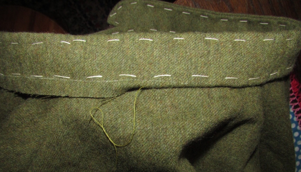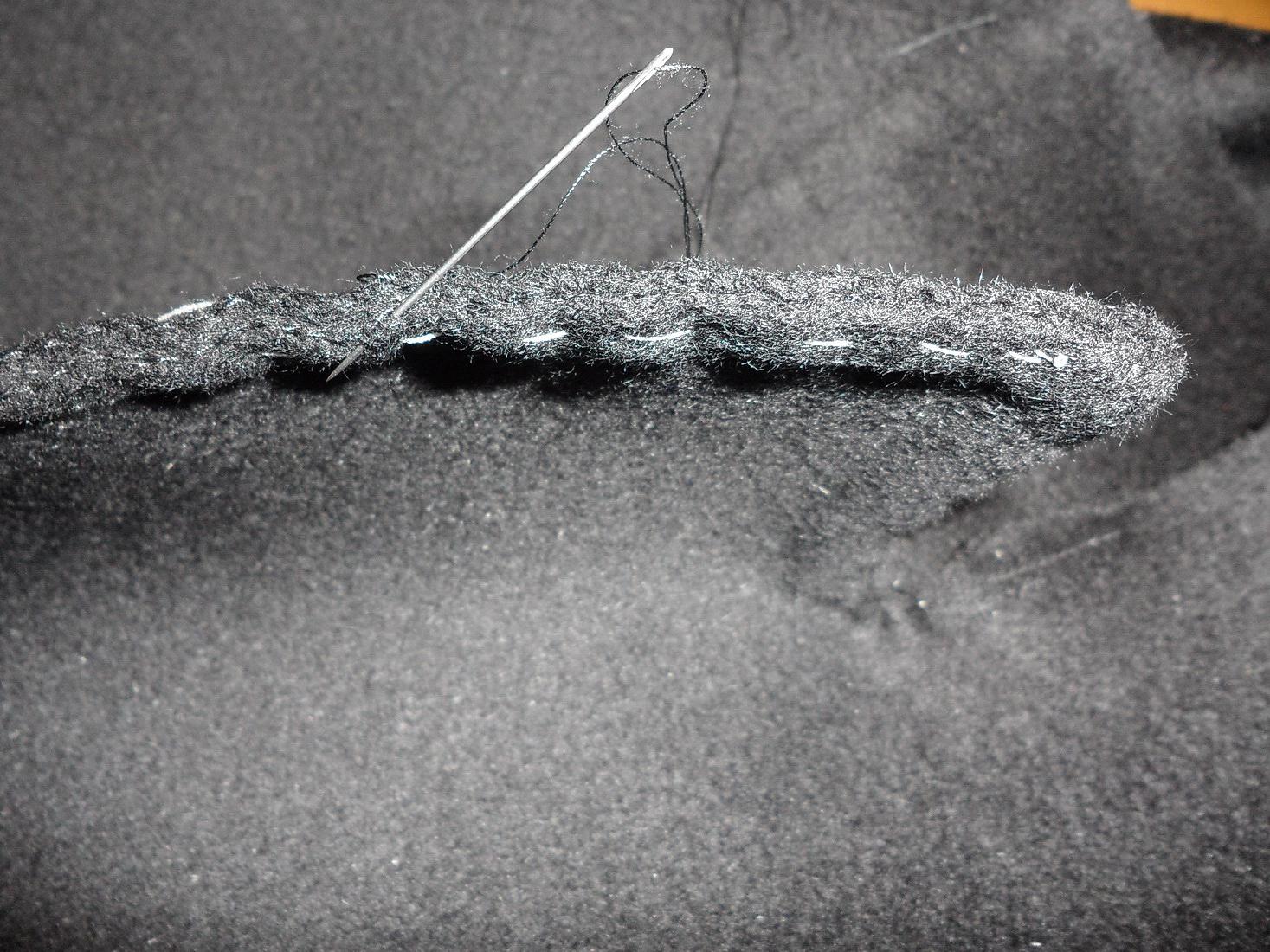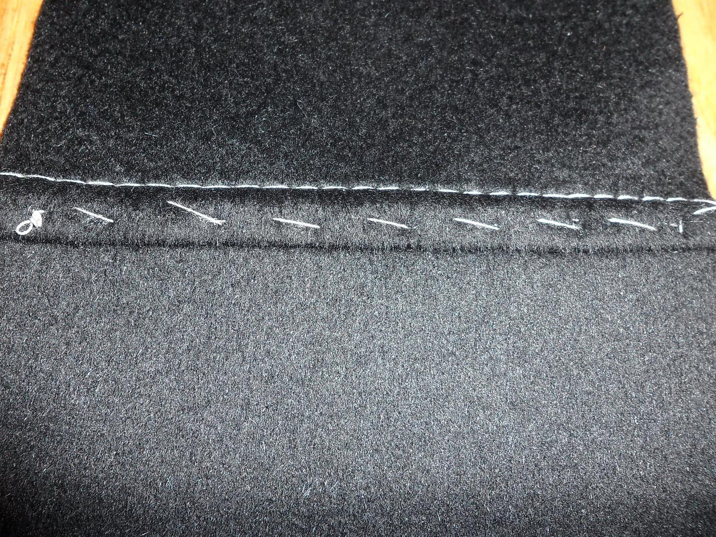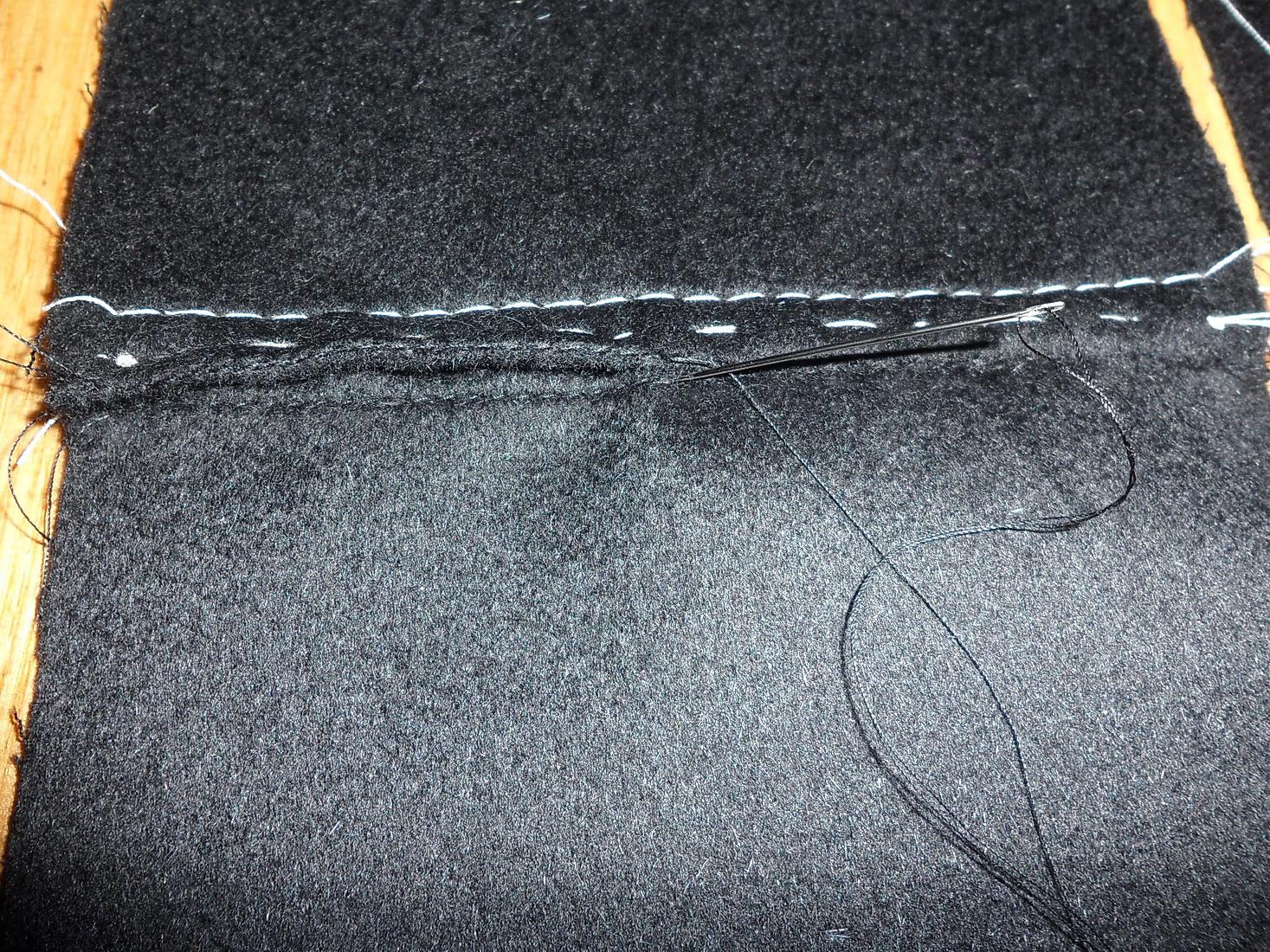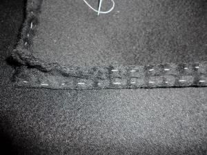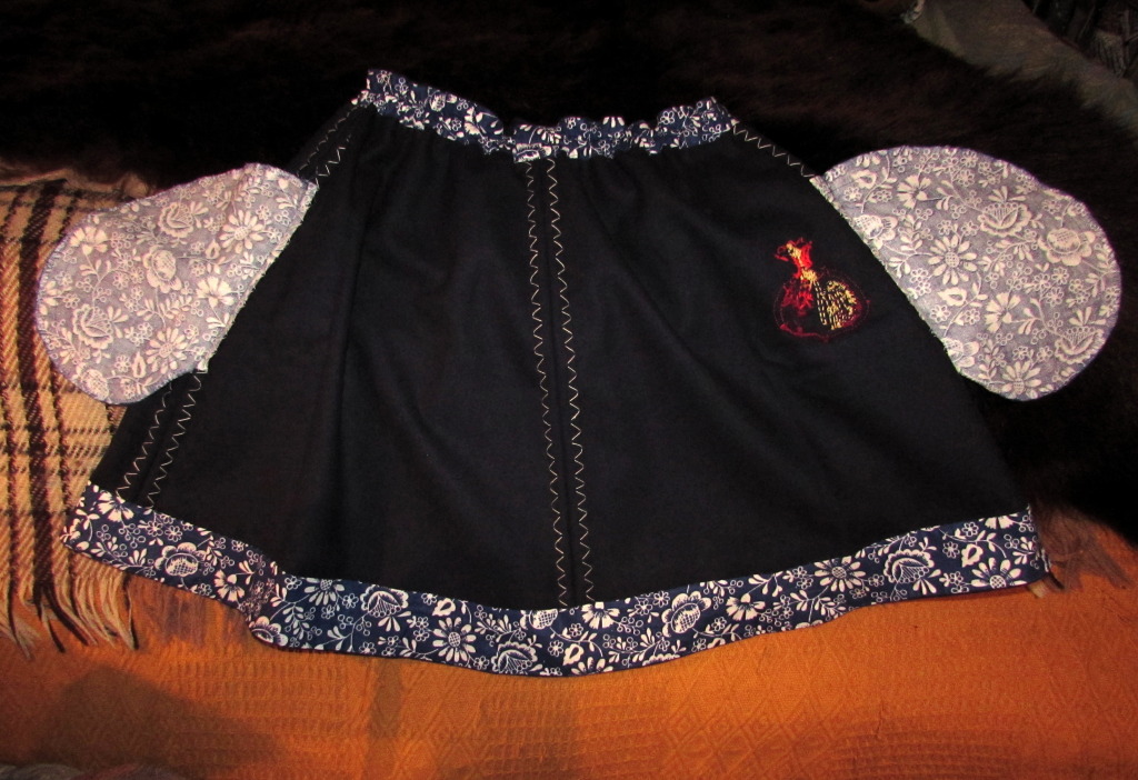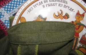Второй сарафанчик: Швы обработаны в целом так же, только на сукне я пришила припуски козликом вперёд. С крылышком пришлось повозиться - не получалась закрутка на этой ткани. Другая подгибка смотрелась грубовато. В итоге сделала не совсем правильную закрутку - козликом вперёд по одинарной подгибке. Делаешь несколько стежков, потом затягиваешь нить: Припуски на юбке загнула всё же вниз, хотя с учётом складок получилось немного толстовато, и отстрочила по лицу точечным швом. Нитку взяла двойную - шерсть, которой вышивала - для цвета и обычную катушечную нитку - для прочности. Так же сделала и отстрочку карманов по переду (карманы самые обычные, в шве). Подгибку низа сделала широкую, но одинарную - пришила изнутри козликом вперёд и снаружи по изнанке тоже им же :) Отстрочка горловины: Продолжение следует...1 балл -