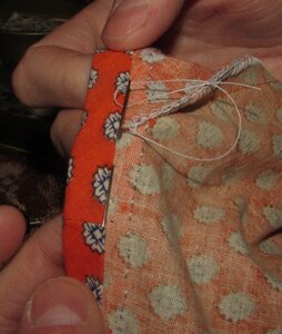 Девушки, большое спасибо, мне очень приятно ваше внимание и интерес! Дончанка, обязательно покажу. Заканчиваю стёжку своих рукавов, немного фото процесса. В книге С. Бриско, по которой я училась, разметка многоступенчатая и очень точная. Но она хороша, если есть хороший маркер, а у меня пока только мыло. Поэтому вместо того, чтобы рисовать сетку, а потом по ней округлые линии кружками-шаблонами, я сделала сразу шаблон элемента. Мне очень нравится этот узор, напоминает красиво уложенные лунницы :) Размечаю основные линии и начинаю вышивать - сначала вертикальные ряды потом горизонтальные Размечаю промежуточные линии по одному ряду, чтобы мыло не осыпалось: горизонтальные и вертикальные В результате простых шагов получается узор, кажущийся очень сложным :) Готовый рукав. Внизу узор ханмару цунаги (пересекающиеся круги), потом три полоски, вверху узор татеваку (стебель) - размечается овальным шаблоном, стегается отдельными вертикальными рядами, очень просто. Техника самой стёжки тоже очень простая: набираю на иглу побольше стежков, протягиваю нитку и расправляю, чтобы не было никакого натяжения: Когда нитка кончается, привязываю следующую специальным узлом: У С. Бриско сказано, что такой узел позволял экономить нитки - стегают длинной иглой, и нужно оставлять соответственно длинный конец, чтобы спокойно завязать узелок, а при таком способе можно и 1 см оставить, и даже меньше. А мне думается, что есть ещё один смысл в таком узле - нитка остаётся непрерывной, и в стёганом полотне нет никаких слабых мест - пропусков в нитяной "арматуре". Учитывая, что для сашико использовались старые ткани в несколько слоёв, прочность была важна.1 балл -