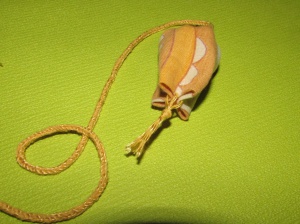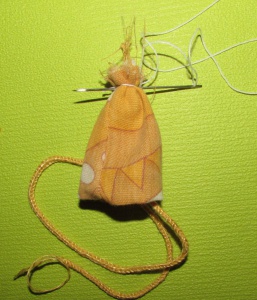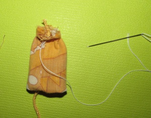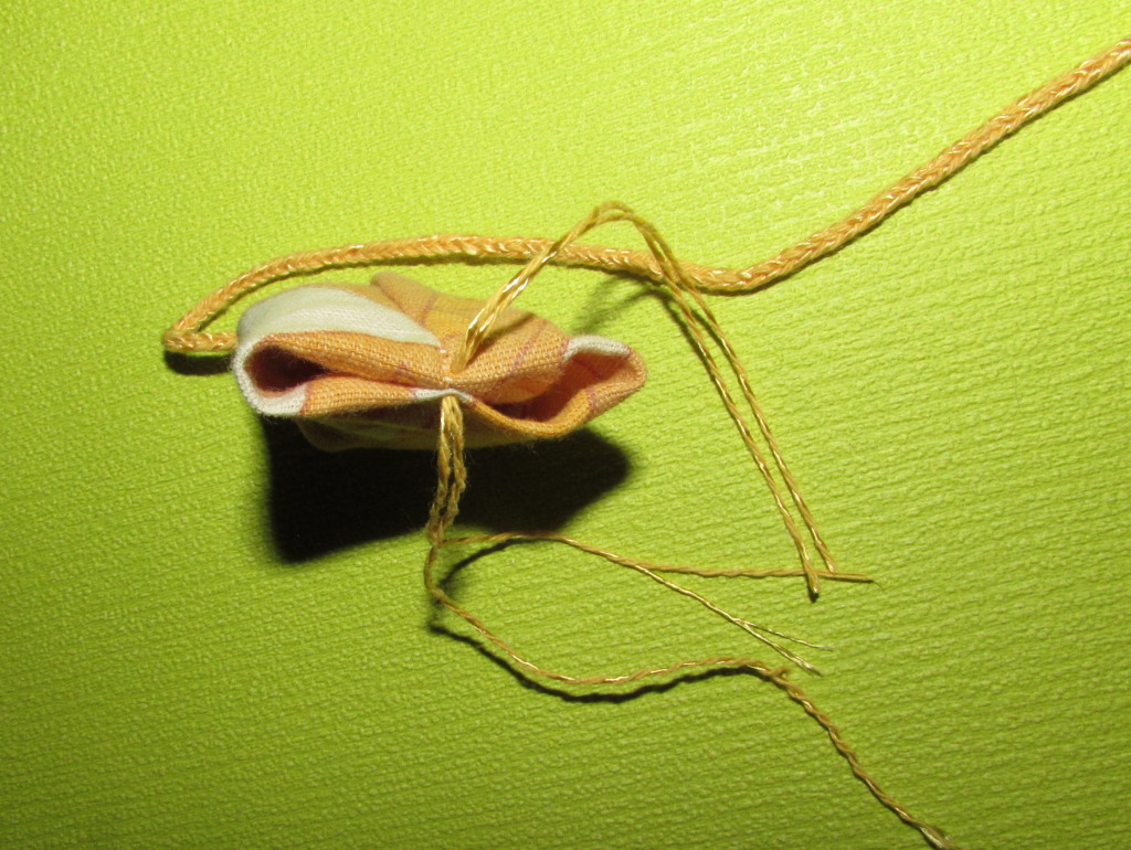 Спасибо, девушки, за интерес и тёплые слова. Мушка, японские колокольчики я нашла в книге С.Бриско "Сашико. Японское искусство вышивки", но там всего одна картинка, поэтому сделала небольшой фотоурок :) 1. Берём прямоугольный лоскуток и шнурок 2. Складываем лоскуток по длинной стороне изнанкой наружу и сшиваем длинную сторону любым способом (у меня шов полустрочка) 3. Выворачиваем наполовину - получается трубочка, с одного края которой сгиб ткани, с другого - срезы. На конце шнурка завязываем узелок 4. Собираем на нитку тот край, где срезы (оба слоя ткани одновременно прокалываем), надеваем трубочку на шнурок вверх ногами :) и затягиваем нитку под узелком 5. Для крепости я оборачиваю этой ниткой сборку и несколько раз прошиваю насквозь, прокалывая шнурок, тоже под узелком 6. Выворачиваем 7. Делаем тычинки: вдеваем в иглу двойную нитку, узелок не завязываем. Складываем колокольчик у сгиба так, чтобы он лежал плоско, и пропускаем нитку через середину противоположных сторон. Оставляем довольно длинные концы, которые позволят позже завязать узелок, и обрезаем 8. Поворачиваем колокольчик на 90 градусов и повторяем то же самое с двумя другими "сторонами" 9. Собираем все нитки вместе и завязываем простой узел - можно у самого края колокольчика, можно немного отступить, тогда "лепестки" будут сомкнуты неплотно 10. Обрезаем нитки до желаемой длины тычинок 11. Всё готово :)1 балл -