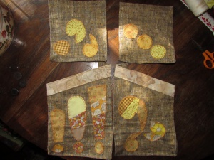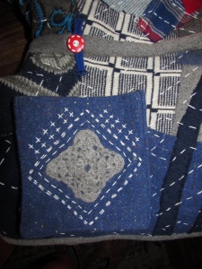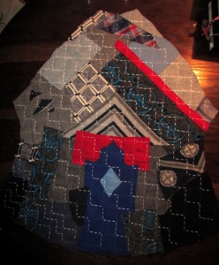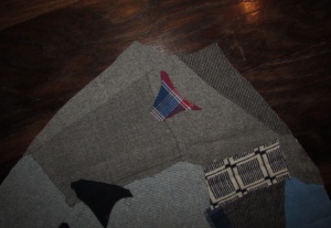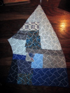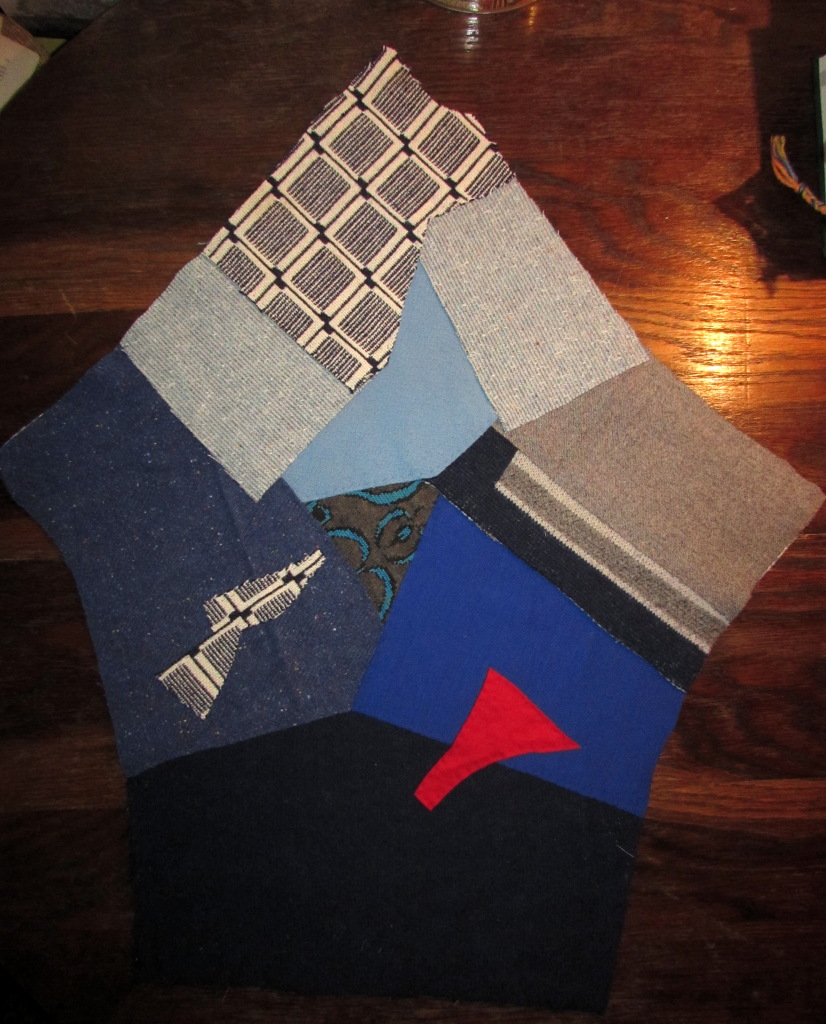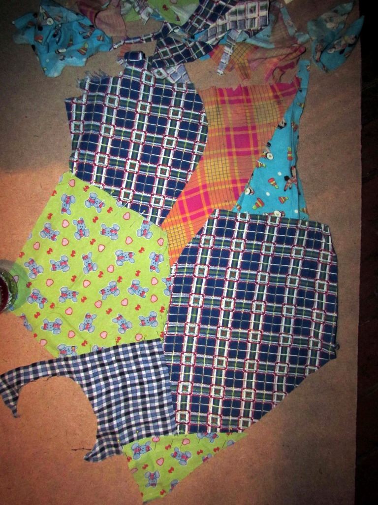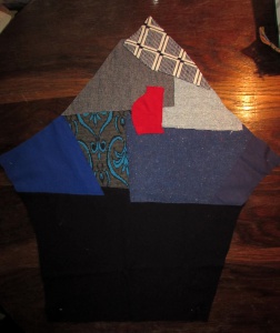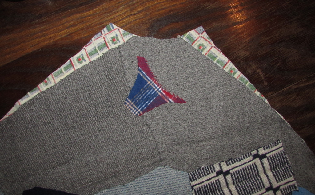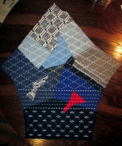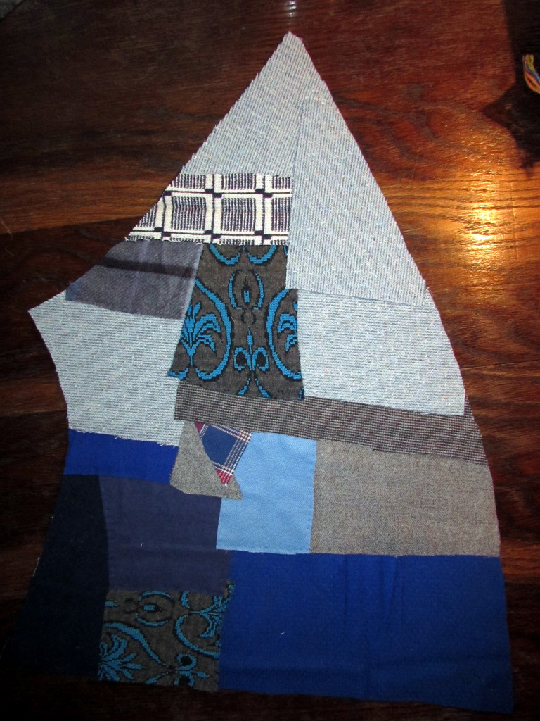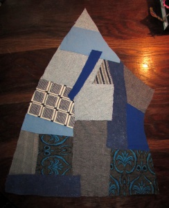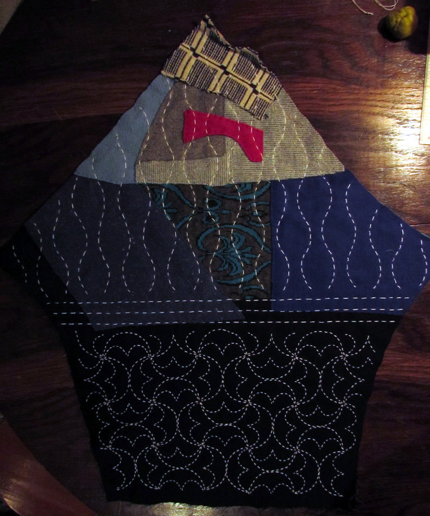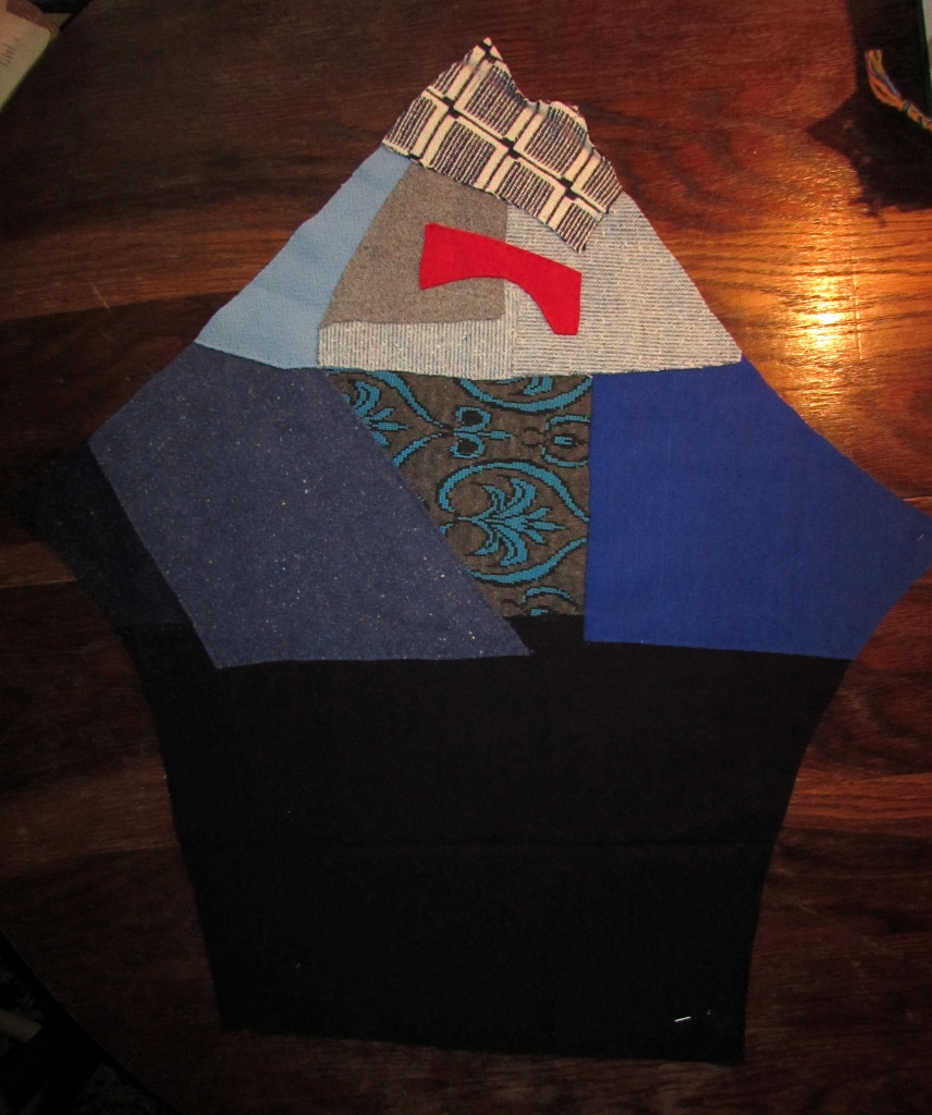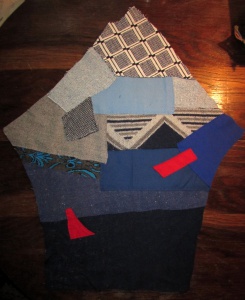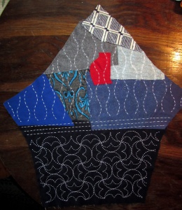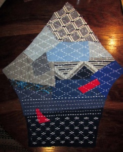 Всем привет! :) Спасибо за отзывы, девушки! Покажу начало новой задумки. Идея - сшить что-то вроде лёгких то ли кофт, то ли курток на прохладное межсезонье, когда в рубашке выходить во двор уже холодновато, а в ватнике очень жарко. Свитера не подойдут, поскольку при ветре, даже небольшом, не греют вовсе. Решили сшить что-то простое, чтобы накинуть и пойти. Значит, запах и никаких застёжек, только пояс. И - учитывая умеренную ветрозащиту - подкладка и стёжка, а ткани лучше поплотней. Само собой, хотелось чего-то лоскутного. В синих тонах. И сашико. Распорола всё, что было синего в закромах, включая старые свитера. Муж сделал на скорую руку подвесной столик, чтобы разложить всю палитру. На подкладку пошли старые фланелевые рубашки, очень мягкие. Подкладка тоже лоскутная - по необходимости. Накладывала на выкройку лоскуты с перекрытием на краях, скалывала, сшивала точечным швом, потом кроила. На готовые детали подкладки так же накладывала лоскуты верха (уже не как попало) и тоже все сшивала точечным швом близко к краю, захватывая и подкладку. Потом подрезала лишнее. На наружных половинках переда не удержалась и сделала аппликацию. Муж захотел цветок, получилось легко и быстро. А я поначалу думала соорудить птичку, но дело не пошло. Что ни нарисую - не то. Что ни найду готовое - не подходит. Наконец до меня дошло, что птичку мне не надо, а надо планету :) Как только я это поняла, она "нарисовалась" за 5 минут, и даже ракета попалась под руку - лоскуток от срезанной вытачки, которую лень было пороть :) Пока вот что получилось. Показываю детали без стёжки. Перед стёжкой одну куртку сметала, померили, но фото не сделали. Дальше предстоит стегать. Куртка мужа: спинка, детали переда и рукава Моя куртка (детали в том же порядке):1 балл -