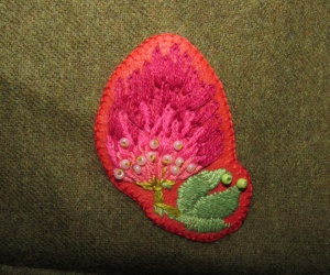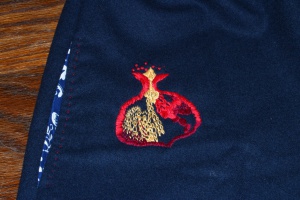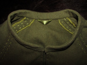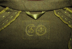 Продолжение Про воротник. Дублировала плотной бязью внутреннюю сторону (бязь скроила с припусками и пришила одновременно со стачиванием деталей). Потом пришила в горловине внутреннюю сторону, сметала воротник, сгибая так, как он будет лежать на шее и делая небольшой кантик на внешней стороне. А потом у меня не хватило ткани припуска, чтобы нормально пришить к горловине внешнюю сторону воротника, и я пришивала её, как аппликацию - подгибая по 2,5 мм и подшивая потайной "восьмёркой" вручную. Получилось вроде неплохо, хотя на краях можно было и лучше. Чем сложнее процесс, тем меньше получается фотографий - трудно отвлекаться. Низ прихватила "козликом вперёд", потом подшила обычным "козликом". Подгибка одинарная. Козликом же обработала изнутри молнию (с ней ничего необычного, фото нет). Швы обвязала крючком и решила тоже прихватить "козликом вперёд", наметала, и нам с мужем понравились эти линии намётки вдоль регланных швов. Поэтому я прошила их теми же нитками и с тем же шагом, что на клапанах карманов. А боковые сделала, как задумывала. Только на линии талии оставила свободными - там получился довольно сильный изгиб, и припуск не уложить без надсечек, а я про них вспомнила только после того, как обметала. И на рукавах припуски тоже оставила свободными. Изнанка: Низ рукавов сделала на резинке, отстрочила по краю 2 мм и обшила обмёточным швом, а то это место быстро обтрёпывается: Выше кармана пришила нашивочку - подарок дочки :) Она вышивает разные картинки на кожзаме, вот и нам подарила: мужу клевер (он увлечённый ботаник-любитель), а мне - мышку-царевну! (покажу на своей куртке). Вот и всё. Наш знак с инициалами мужа и общий вид: Девушки, мне бы очень хотелось услышать критику - что сделано не так, что можно лучше... Благодарю за внимание.1 балл -