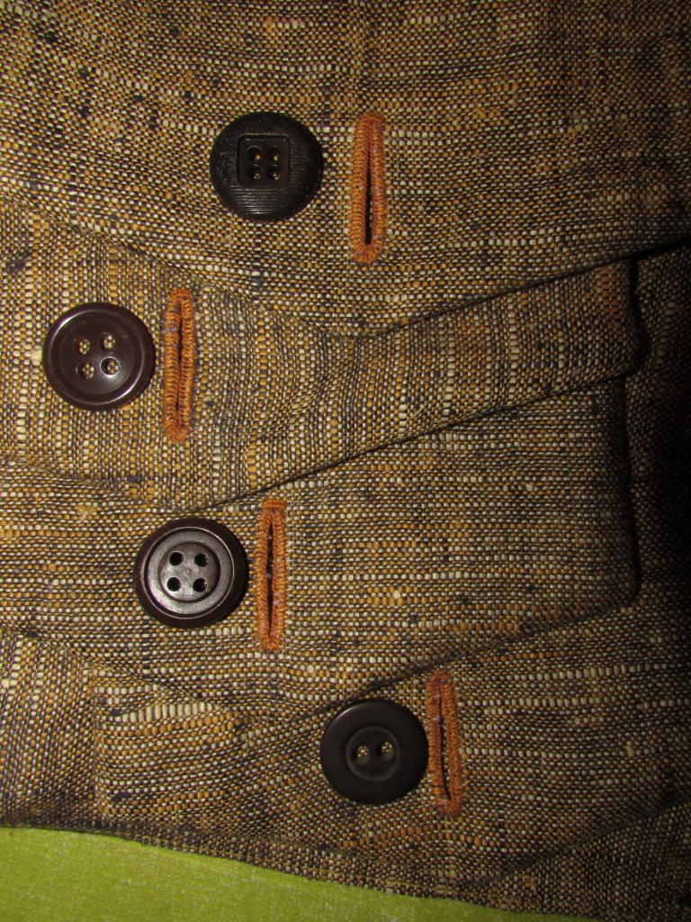 Девушки, спасибо большое!! Ещё маленечко продвинулась, несмотря на жару - кармашки, петельки, пуговки... Осталось пришить на место. Ткань очень неровная - нитки переменной толщины, - поэтому петельки не такие аккуратные, как должны бы. Ещё раз спасибо Фросе за МК по петлям - память у меня так себе, поэтому сделала конспект по шагам и всё время пользуюсь :) Пуговки тоже будут разными.1 балл -