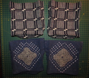 Всем привет! :) Продолжаю стёжку. Пришлось отвлекаться на другие дела, так что готово пока только 5 деталей из 10, на что ушёл весь клубок ниток размером примерно с "Ирис". Я думала, у меня таких ниток много, но оказалось, больше нет. Придётся теперь стегать "Снежинкой", она чуток потоньше. Очень нравится, как стёжка преображает лоскутное полотно. Рукава для куртки мужа. Нижнюю часть всех рукавов нарочно сделала тёмно-синей, чтобы поместить узор поинтересней. Здесь касури цунаги - узор, заимствованный у тканей касури, популярных в эпоху Эдо. Давно хотелось попробовать, он вышивается немного не так, как обычные узоры. Над ним несколько полосок, потом узор из ромбов (хиси мойо). И половинка переда тоже для куртки мужа. Узор фундо (весы).1 балл -