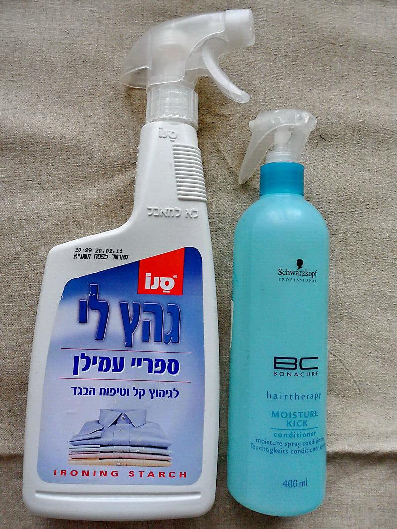 Немного о ВТОшных помощниках. Доска у меня самая обычная … собираюсь-собираюсь ее заменить … и не меняю ... Парогенератор на 3 литра, стоит на столике в углу и, в общем то, с середины комнаты не виден … удачная длина провода – 2,25м … регулируемый пар (на максимуме – очень сильный, использую для работы минимальный). Когда знаю, что гладить придется в час по чайной ложке, то пользуюсь утюгом (он с автоотключением). В бутылках запасы дисцилированной воды … при заливе разбавляю ее кипяченой. Так как я девушка не очень нежная и делаю иногда резкие движения, то с колодкой не смогла подружиться … она у меня под тяжестью утюга заваливается при работе … Зато очень полюбила бруски для застаивания швов … весом 1,5 кг … тяжеленькие … и мне удобно. "Подушки" … ту, котарая по форме рукава, сразу не обтянула … надо бы, но пока пользуюсь такой. Для приутюживания швов, во избежание пропечатывания на лице, подкладываю под них такую «палочку» … это перекладина от деревянной вешалки. В поперечном сечении – подковка … значит контакт с утюгом будет на очень ограниченном участке (вершине)… и тогда получается, что утюжу саму строчку, а припуски – совсем слеганца … Длины только маловато, обещали сделать повыше-длиннее … Для подкрахмаливания деталей и срезов в отдельной бутылочке развожу с водой вот такое средство … когда закончится попробую применять шлихту по сезоновскому рецепту.1 балл -