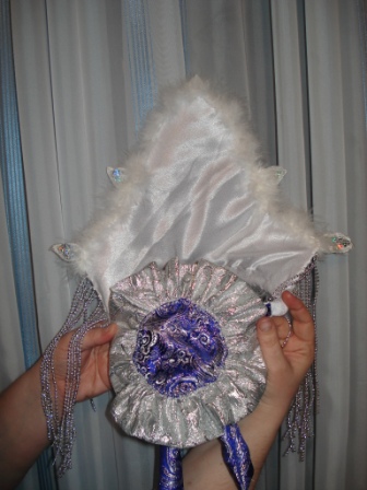 Костюм Снегурочки и кокошники. Первый костюм из портьерной ткани. Шить-врагу не пожелаешь. Наверное, у меня опыта не хватило. Все полочки пришлось посадить на дублерин, потому что ползет, не взирая на оверлок! По выкройке вечернего платья с вертикальными рельефами ( из "бурды") Из экономических соображений сделаны разрезы на рукавах. Костюм украшен лебяжьим пухом, бусинами, стразами, жемчугом и пайетками все вышито вручную. Кокошник крупным планом.1 балл -