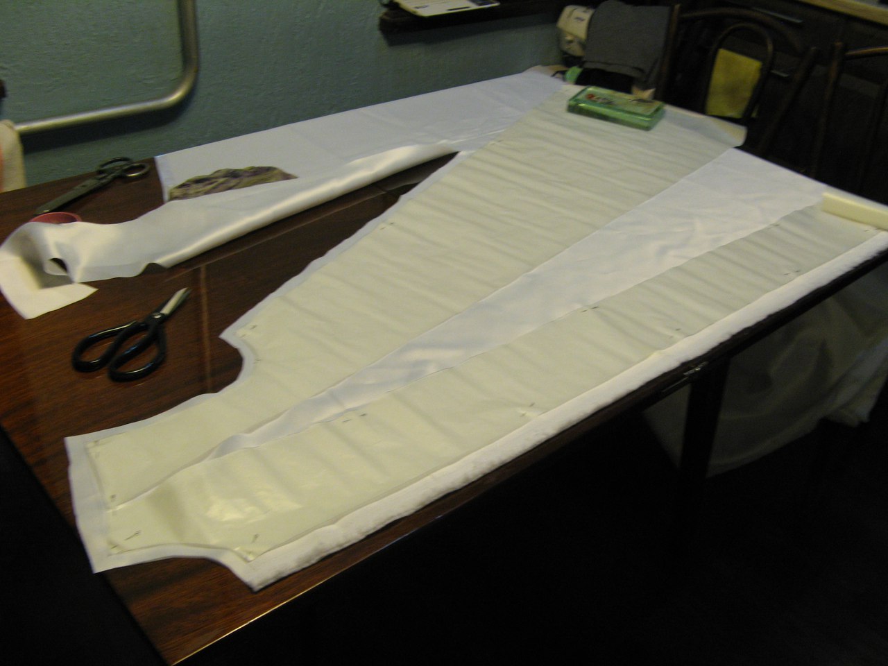 Там два вида парчи и крупная серебристая сетка (мне кажется, в нее букеты заворачивают). Технология достаточно проста, но трудоемка. Сначала выкраивается деталь, в данном случае центральная вставка переда. Лучше дать запасы по всем срезам где-то по 3-4 см. Деталь укрепляется клеевой прокладкой (я использовал тканевую, флизелин менее надежен, я считаю). На изнаночную сторону детали нанес рисунок. Получившиеся контуры надо прострочить прямо по изнанке. Строчку лучше выбрать имитирующую цепочный шов, или любой шов для стрейча. Такой шов не даст ткани "осыпаться" по краю. Вырезать узоры близко к строчке. Получившийся ажурный рисунок накрыть сеткой. Т.к. это все-таки карнавальный костюм, я внес некоторые изменения в технологию. Сетку я не стал приметывать, а приклеил по контуру. Использовал клей-гель "Момент" (ярко-синий тюбик), он полупрозрачный и после высыхания остается гибким. Конечно, сначала лучше попробовать на кусочке, чтобы клей не проступал сквозь ткань. Если проступит, то лучше все приметать. Следующий слой "сендвича" - вторая ткань. Снова все склеиваем-сметываем. Теперь переворачиваем на лицо и начинаем строчить узор. Шов на машинке надо выбрать для пришивания аппликаций. Он декоративный и хорошо фиксирует срез. Вот, собственно, и все. После все хорошо проутюжить, осноровить (отрезать лишнее) по лекалу, оставив припуски на швы. Деталь готова. Также сделано "ожерелье" - кокетка переда и спинки. Отделка стразами, бусами и прочим уже на готовом изделии.1 балл -