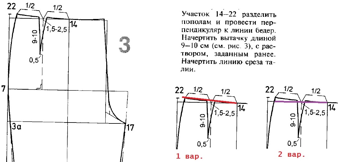 mara0712 Опубликовано 26 марта, 2014 Поделиться #947 Опубликовано 26 марта, 2014 Добрый день! Подскажите пожалуйста, я только учусь шить брюки, и решила попробовать по Мюллеру. У меня возник вопрос по передней половине брюк, по вытачкам. в книге написано что надо разделить линию 14-22 пополам, это какую именно (1 вариант на картинке или второй) и провести перпендикуляр, а почему тогда вытачка наклонена?? И как надо выбирать раствор вытачки? почему на картинке 0, 5? Ссылка на сообщение Поделиться на другие сайты Поделиться