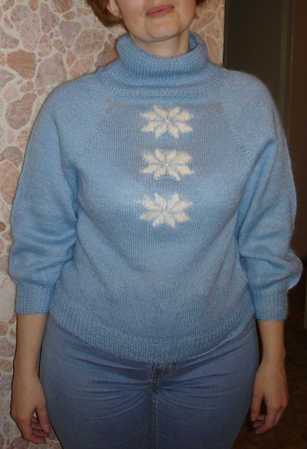 Домомучительница Опубликовано 5 февраля, 2011 Автор Поделиться #67 Опубликовано 5 февраля, 2011 До сапогов как-то руки пока не дошли. А вот из остатков пряжи от шарфа-башлыка связался джемпер (ну да, вот такие оказались "остатки" - закупалась, как истинный хомяк, с запасом :)))Носить мне его не пришлось - оторвала с руками в качестве подарка к Дню рождения племянница, но я не очень-то жалею - кусается, подлец. Вязался доооолго, пряжа тоненькая. Воротник почему-то не путем - хомутом почти, хотя вроде резинкой связан. Рукава короткие, на нормальные пряжи уже не хватило. Зато к джинсам идеально подошел. Мои обожаемые жаккарды хоть чуточку, но пролезли. Да и голубой цвет, опять же. Норвежский свитер не носится никак - ну не ношу я ничего, кроме платьев :((( Присматриваюсь довязать его тоже до колен - как думаете, дамы, весна будет холодной? Что мокрой - однозначно, вон сколько снегу намело. А вот будет ли ветреной да холодной...Зимой не сношу - на работе просто жара, окно открываю все время, не выживу в теплом. Вот уж когда отключат тепло, а черемуха расцветет... Строчу на машинке и в газеты, вяжу для души. Ссылка на сообщение Поделиться на другие сайты Поделиться
