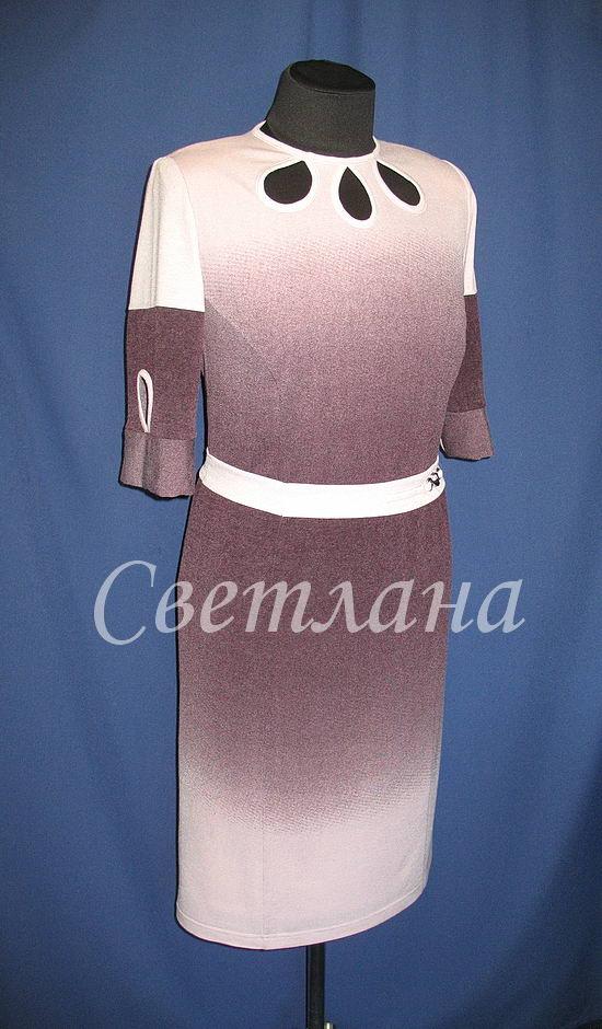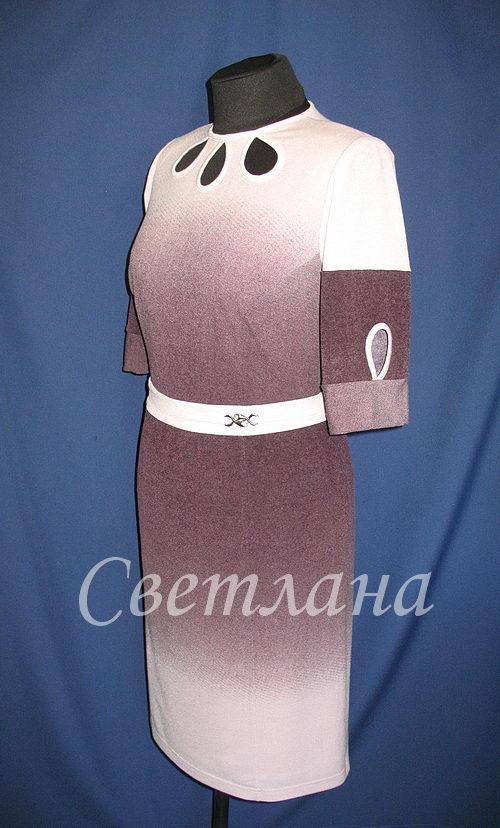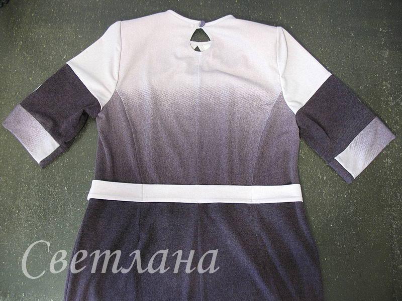 Ткань - трикотаж. Рисунок в отрезе переходил от светлого к самому тёмному, потом резко к светлому и опять в тёмный цвет. Решили светлые части разместить у горловины и внизу платья, а на талии подрез прекрытый поясом.