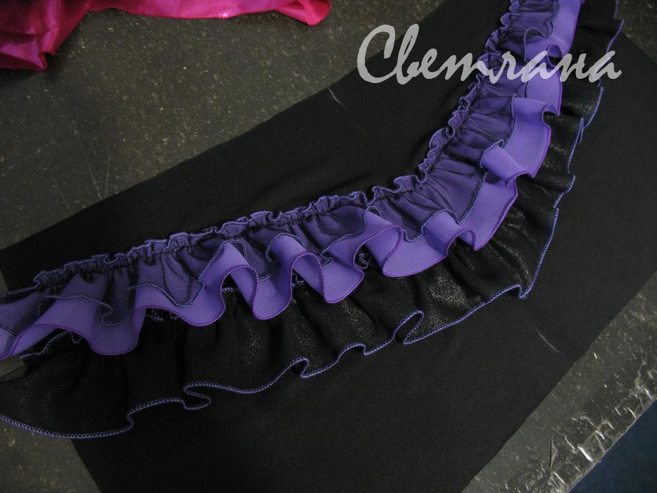 Рюши собирала на узкую резинку и настрачивала ярусами на детали юбки.