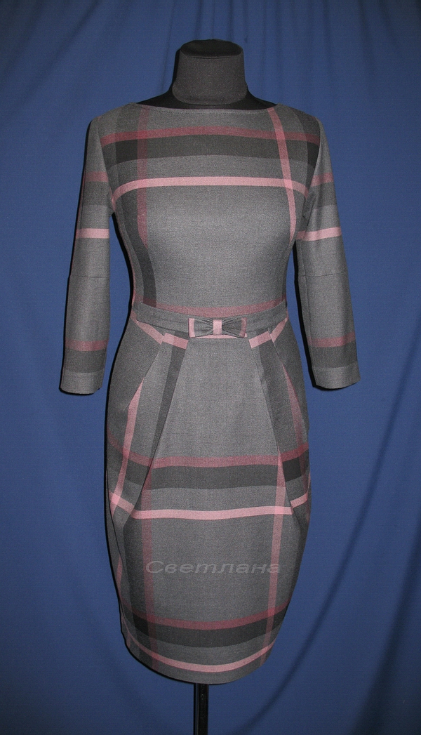 Ну и я вот закончила платье для заказчицы)))) Модель брали из Бурды 8/2009 №128 ,но на примерке количество складок и их объём в районе талии нам не понравился, я перекроила на просто наклонные пару складок. Клетка ужасно не симметричная,крупная, пришлось помаяться,но результатом довольна. Ткани было маловато и рукава получились сточные, что заказчицу не смутило))) Классно было бы поиграть с косой клеткой, но "маємо що маємо")))) На манекен с трудом одела платье,заказчица меньше.