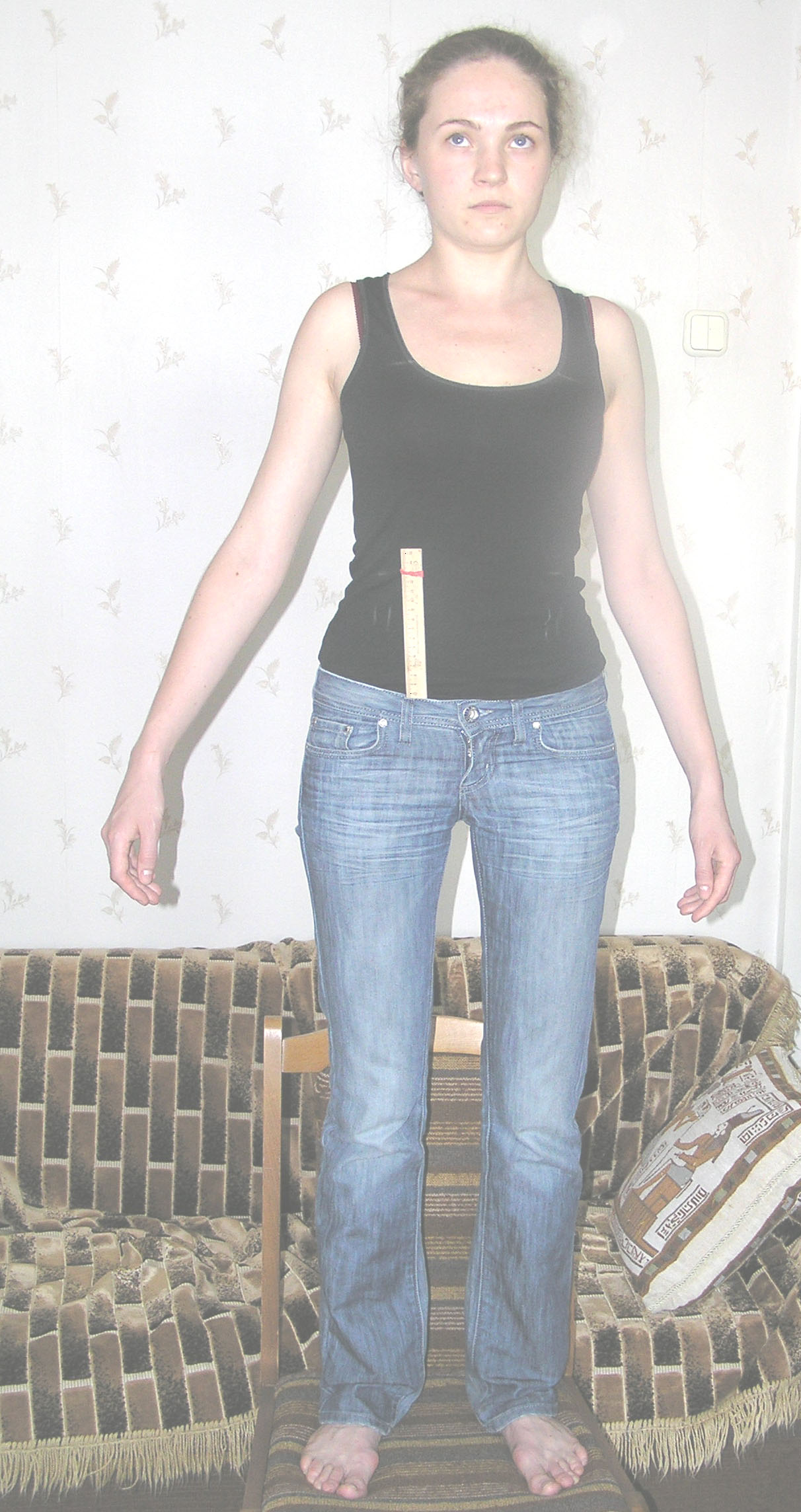 Для всех видов закрепляйте жёсткую линейку (пластмассовую, деревянную, железную – какая найдётся). На линейку можно намотать кольцевую резинку и закреплять булавкой соответственно, на груди, на боку и на спинке так, что бы были видны риски. Как на примере. Ну, вот. Жду результатов.