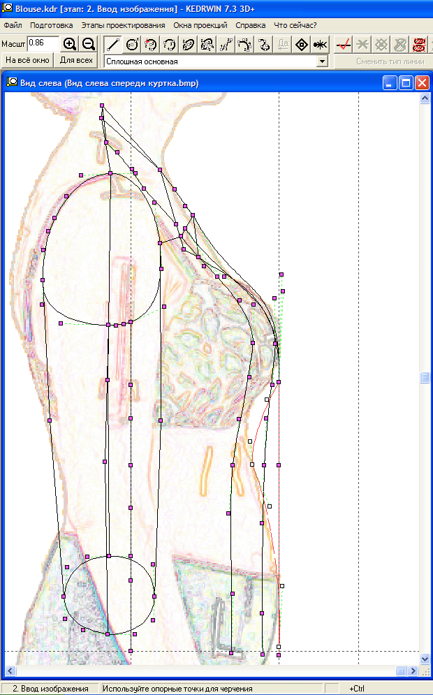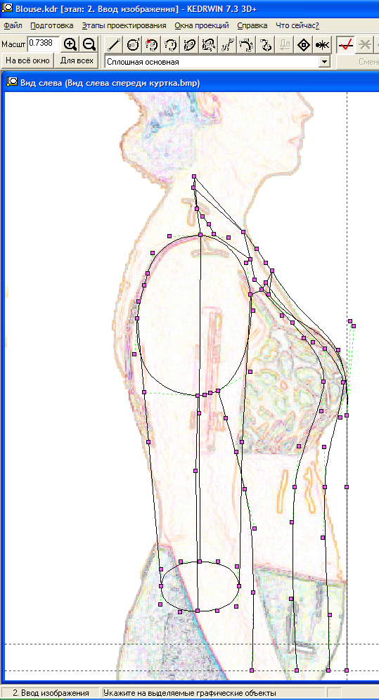 Начнём с самого начала. С подготовки фотографий. Вкратце напомню, что программа KEDRWIN синтезирует изображение 3D изделия по рисункам в плоских проекциях. Использоваться для этого могут 6 типов проекций: вид спереди, вид сзади, вид слева, вид справа, вид сверху и вид снизу. В основном надобность появляется в первых пяти типах проекциях. Вид снизу можно придумать применять для проекций каких-нибудь фуражек или подков для ботинок. Количество проекций каждого типа в одной проекции не ограничено и может использоваться по целесообразности. Что бы облегчить создание изделий, я предлагаю разбивать его на две части: переднюю часть и заднюю и все проекции строить исходя из этого. Поэтому, для симметричного изделия типа нашей блузки-курточки, достаточно использовать проекцию спереди, проекцию слева для передней части и для этой передней части вид сверху. Затем для задней части надо нарисовать проекцию сзади, проекцию вида слева и проекцию вида сверху. Этих шести рисунков будет достаточно, что бы программа синтезировала две модели 3D - одну для передней части, вторую для задней.