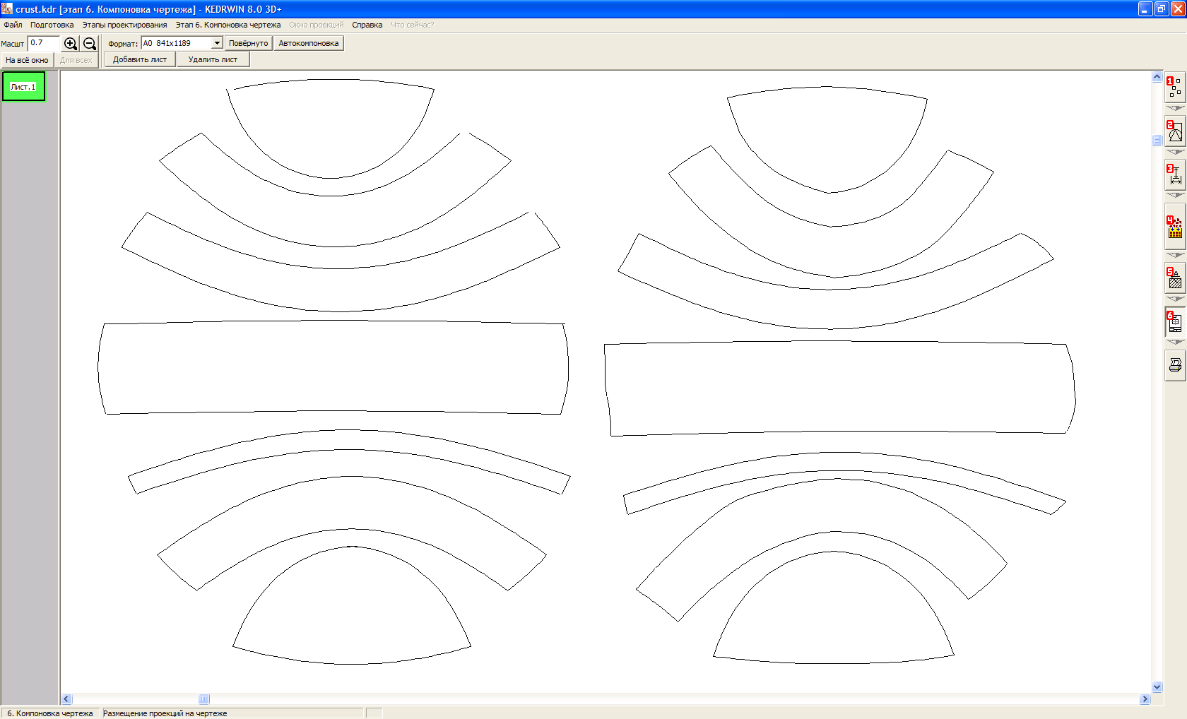 Но есть ещё третий вариант. Зачем нам разворачивать длинные ленты, если на такой длинне с изгибом в пространстве нам набегают искажения? Надо произвести декомпозицию сцены, т.е. разбить её на элементы по проще. Я сделал развёртки отдельно симметричных половинок каждой краюхи (можно было бы и отобразить) и состыковал эти половинки. Вот что получилось: