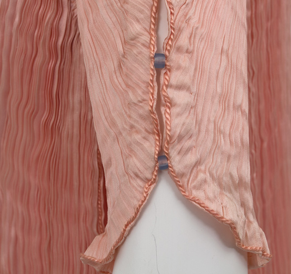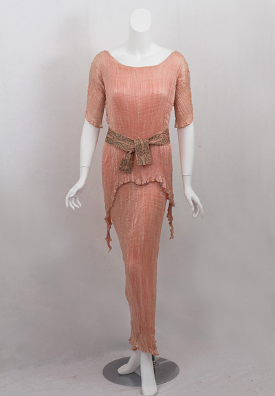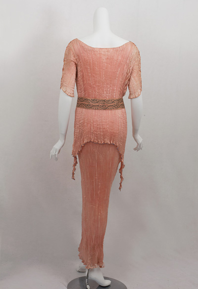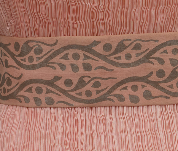 "The richly modulated color of original antique Fortuny gowns, achieved by a series of dye baths, has a mysterious, enchanting depth that cannot be found in modern textiles. The hue of this Peplos is a lovely pastel shade of pink with hints of darker rose and lighter peach."