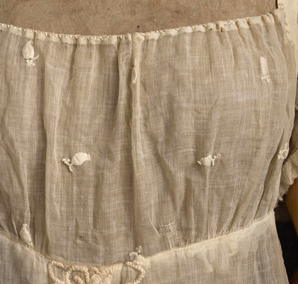 Вырез горловины дополнительно обшит косым швом более толстыми, похожими на шелковые нитками. (Как Вы думаете, это более более поздняя переделка-починка или это намеренно? Красиво ли такое применение нитки в данном случае? Вот так смотрятся толстын нитки на тонкой ткани, и, кажется, здесь швы несут не только функцию декорирования, украшения ...)