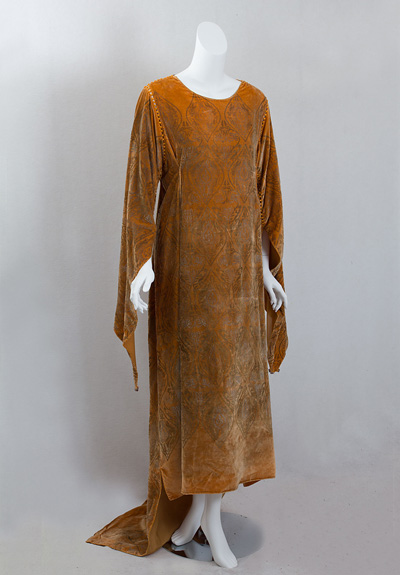 "The gown is weighted on the sleeves and on the tunic hem with strings of blue Murano glass beads."