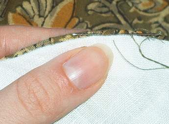 - отгибаем свободный край подгиба вниз. Держим нижний сгиб большим (сверху) и средним (снизу) пальцем, указательным пальцем придерживаем отогнутый край подгиба. Шьём справа налево, начинаем цикл, когда нитка в ткани подгиба.