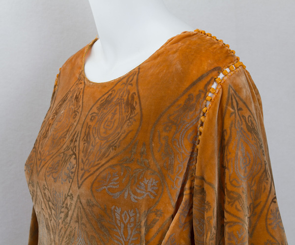 "Fortuny used a thin silk satin more finely pleated than anything ever seen in costume. The resulting garment is incredibly soft and liquid, molding to the curves of the body."