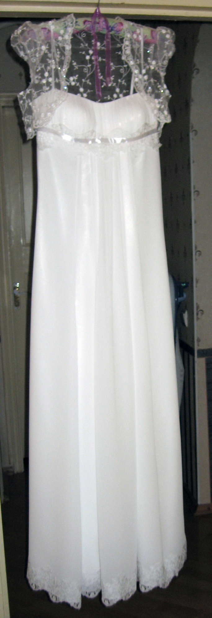 Галина Опубликовано 20 июня, 2009 Автор Поделиться #63 Опубликовано 20 июня, 2009 Еще одно ампирное платье, для очень высокой и тонкой беременной невесты. Может, даст фотографии с торжества, пока - на вешалке. Ткань не дорогая и практичная - п/э жатый шифон. Зато не мнется. Подклад - атлас. Лиф задрапирован, отделан очень качественным кружевом и атласной ленточкой. Это же кружево - по подолу. Болеро из расшитого бисером фатина. Рукава - маленькие фонарики. Чтобы рукава держали форму, они сделаны на фатиновом подкладе. Он практически не виден, пришит узкой зигзагообразной строчкой, как и сам рукав. Из остатков, бонусом, сделана подушка для колец. ГалинаМой альбом Колодец мечты Ссылка на сообщение Поделиться на другие сайты Поделиться