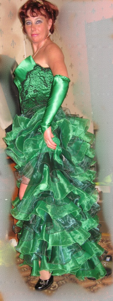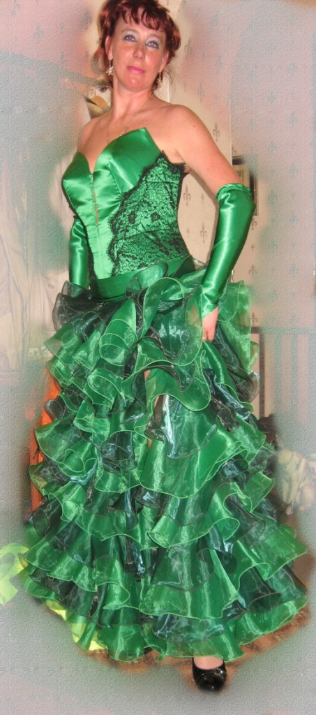 Галина Опубликовано 22 июня, 2009 Автор Поделиться #67 Опубликовано 22 июня, 2009 (изменено) Зеленое платье. Дама была очень довольна, разрешила сфотографировать и ХОТЕЛА разместить фото в сети. Тут же заказала еще один костюм, тоже нарядный. Ее размеры сегодня 102-83-103. Но высокая. Так что - сделала, что смогла. Атлас от вспышки бликует. В реале средняя часть не морщила, причем дама походила, посидела, потанцевала и только потом фотографировали. Расхождение корсета на спине - это специально: особо оговаривалось, что надо так. Собиралась выстрочить шнурок, но вдогонку попросили сшить эти перчатки - и ткани на шнурок не осталось и в магазине уже не было. Сутаж не так гламурно, конечно. Изменено 22 июня, 2009 пользователем Галина ГалинаМой альбом Колодец мечты Ссылка на сообщение Поделиться на другие сайты Поделиться