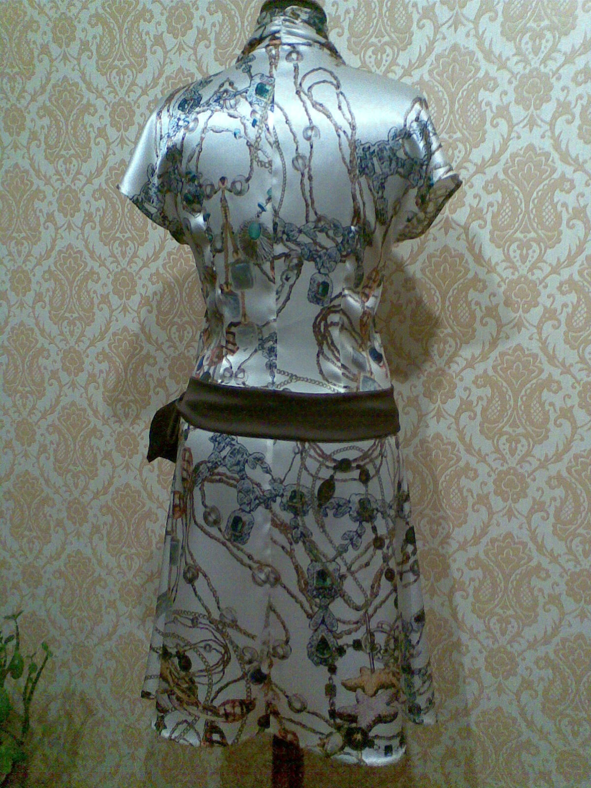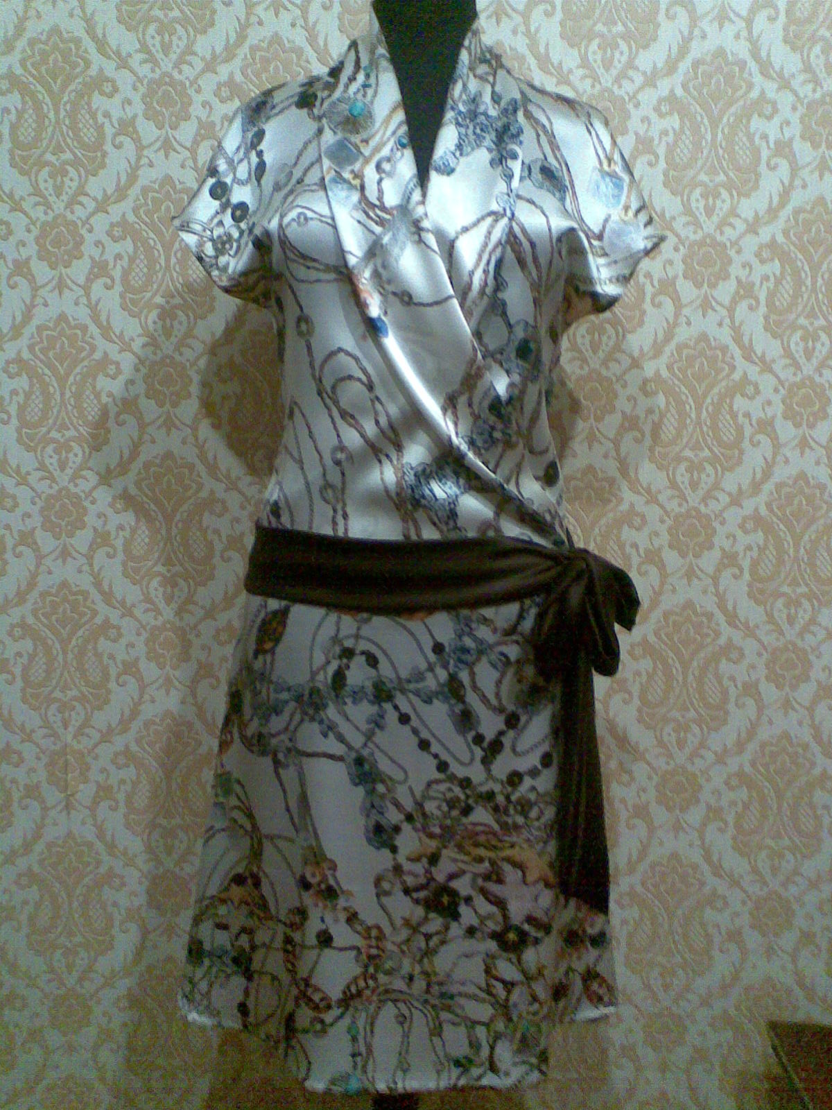 Шёлк с эластаном. Рукав цельнокроенный (типа кимоно), спереди запах, платье с заниженной линией талии. Низ изделия и рукава подшиты вручную (пожелание заказчика).