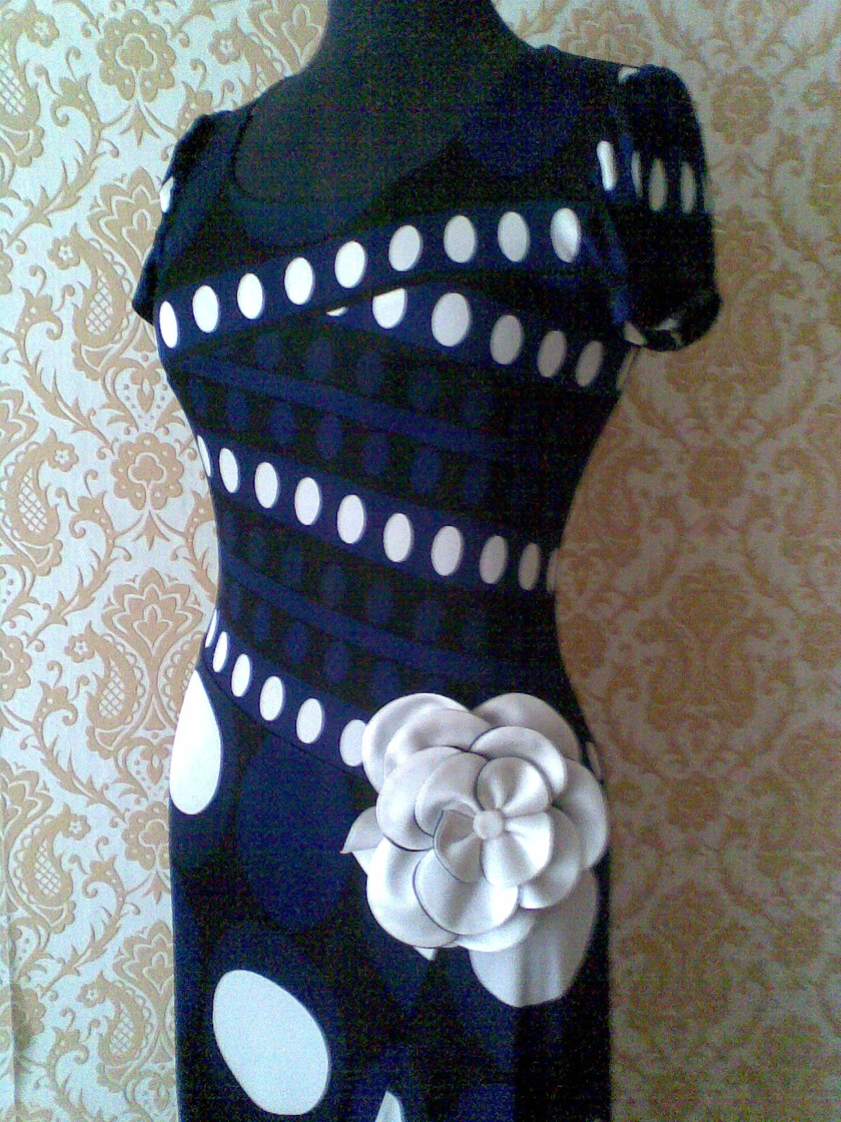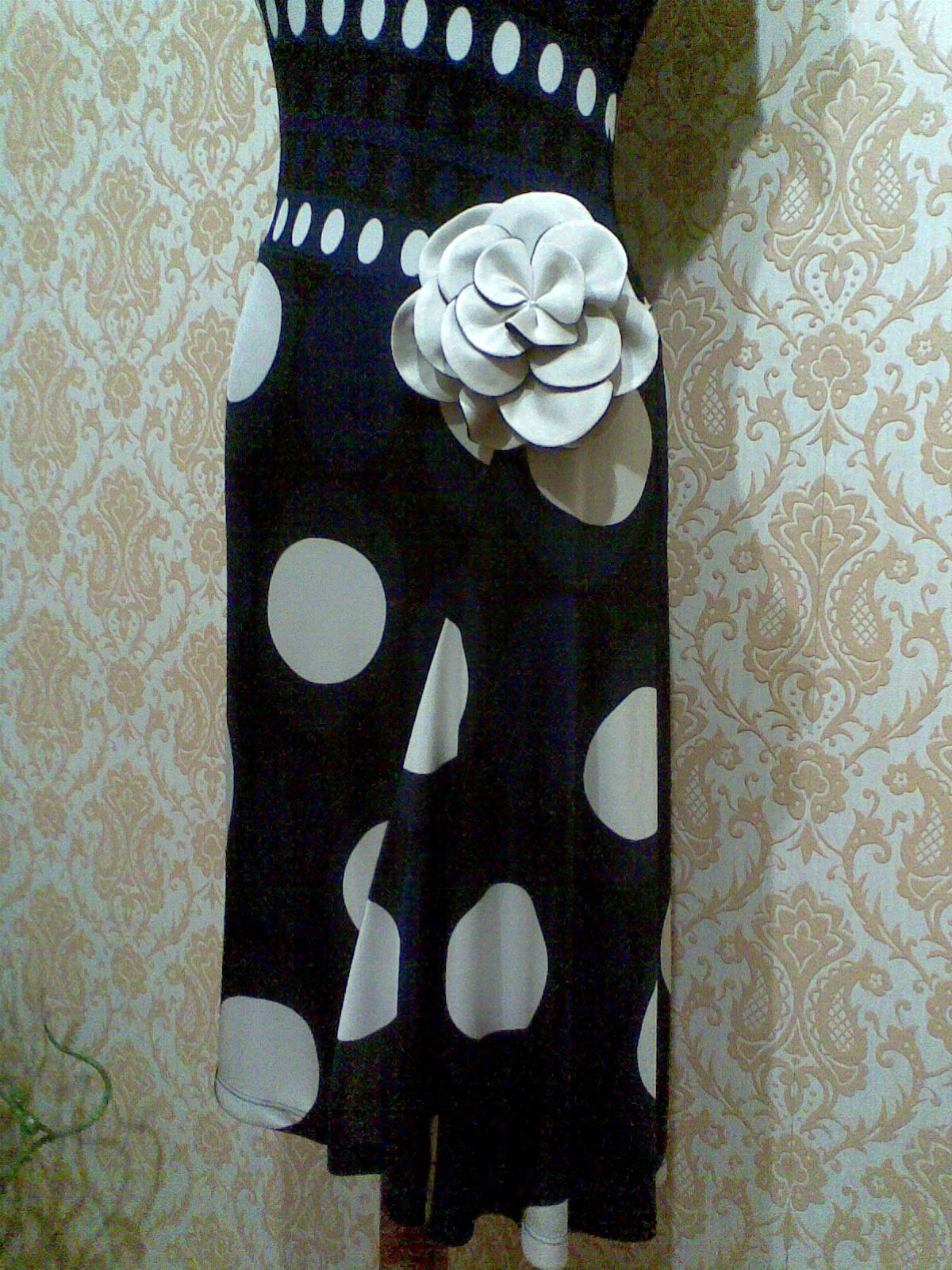 Платье из вискозного трикотажа, рисунок шёл по типу купона, сначалф крупный горох, затем полоски мелкого, пришлось выкроить по диагонали, что бы обыграть, а из оставшегся крупных горошен заказчик попросил цветок