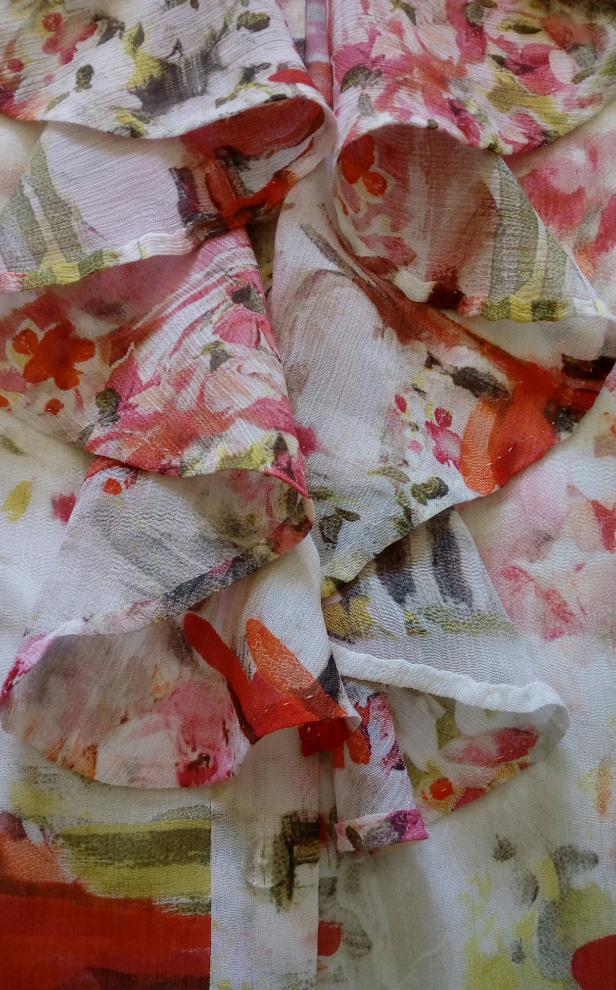 Топ, с воланами по полочке, с отложным воротником и планкой на пуговицах. На подкладке из тончайшего кремового батиста, т.к. шифон просвечивается.