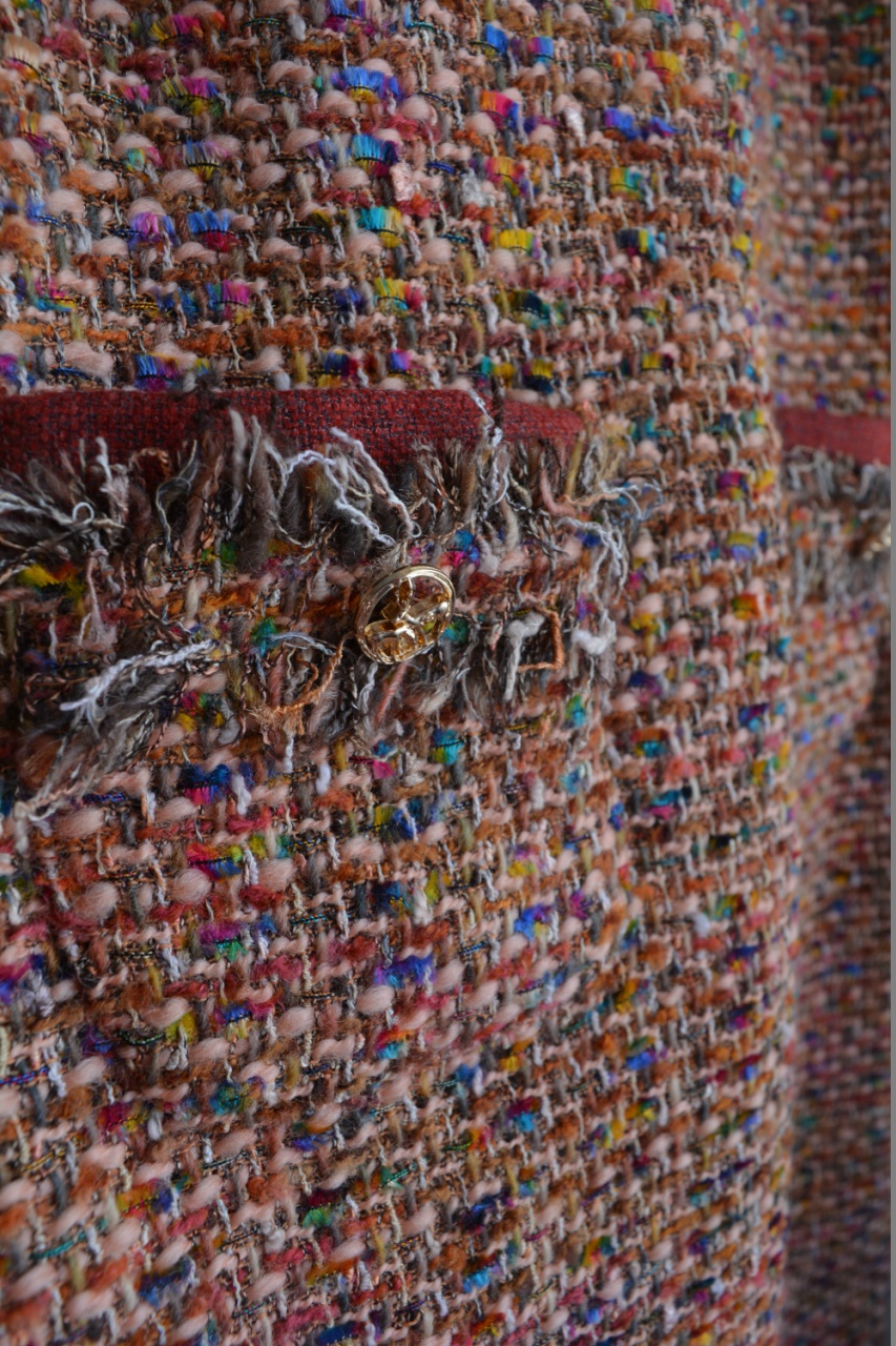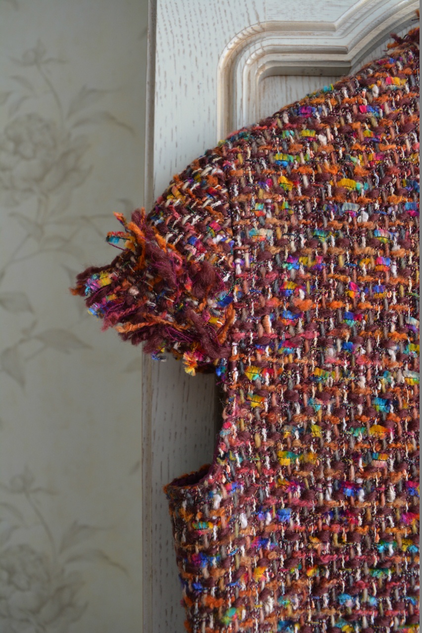 Ткань оригинальная «шанель», у нее очень благородный состав – шерсть, шёлк, мохер. Она в меру пластична, имеет переплетение рогожкой и вкрапления букле. Сыпется щадяще.. Приступая к своей переделке, учитывала, что ткани ровно от прежних деталей, не больше не меньше. Это отразилось на фасоне, он не типичен для жакетов в стиле «шанель». Но мне еще и модель эта в БМ 01_2016 понравилась, я давно наметила ее сшить.