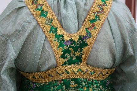 3.Косоклинный со средним расширением, глухой, грудка атласная, под грудкой сборочки, украсы шитьём, бязь.