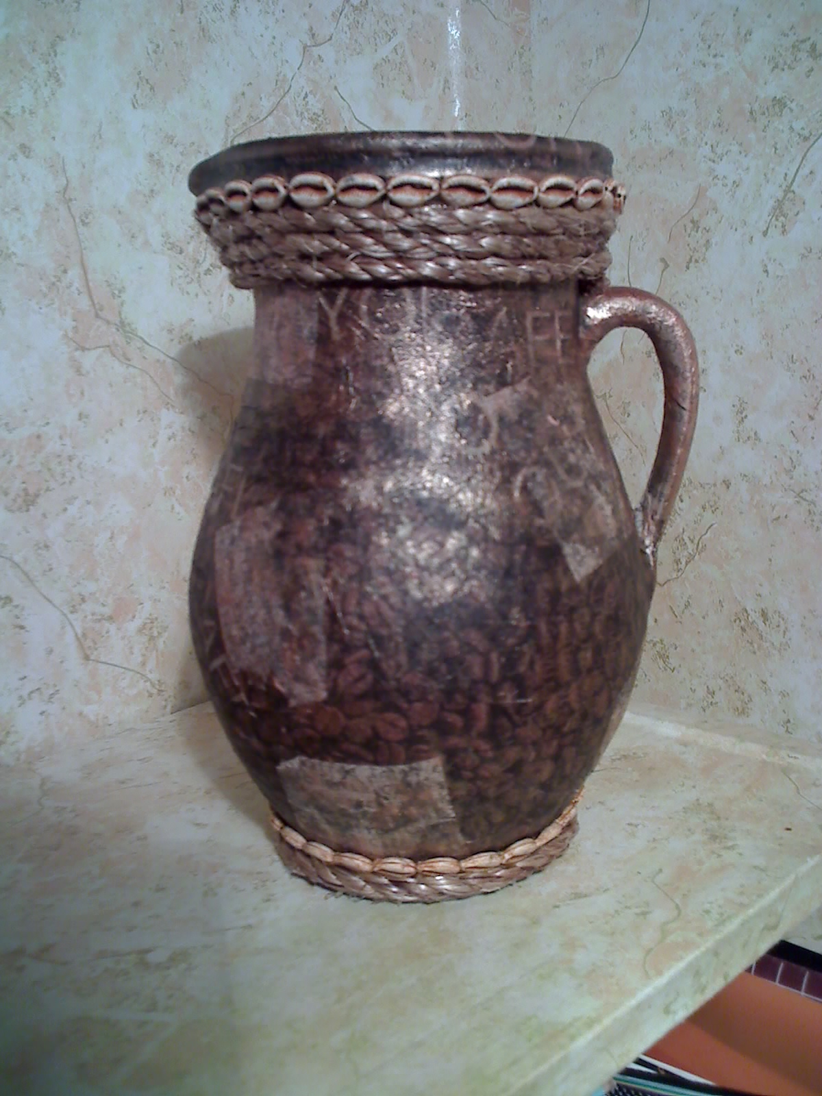 *Inka* Опубликовано 1 декабря, 2010 Поделиться #380 Опубликовано 1 декабря, 2010 (изменено) Эти глечики - моя первая работа в технике "декупаж". Делала так, как "душа просила", без правил, без крекилюров и т.п. Но лаком обязательно вскрою, будут стоять на кухне. Салфетки разрезала (рисунок в квадратики), клей ПВА, оттенила акриловой краской "бронза" с помощью губки, канат из строительного магазина и декоративка (кладязь - секонды, выискиваю расшитые индийские сумки и т.п., можно найти такую шикарную фурнитуру! может не в тему, но если модератор будет не против, вставлю фото из последних сокровищ-пряжку, приспособлю на сумку). Декоративку клею на клей для пенополистерола, он прозрачный, быстро сохнет. Изменено 1 декабря, 2010 пользователем goeland Ссылка на сообщение Поделиться на другие сайты Поделиться