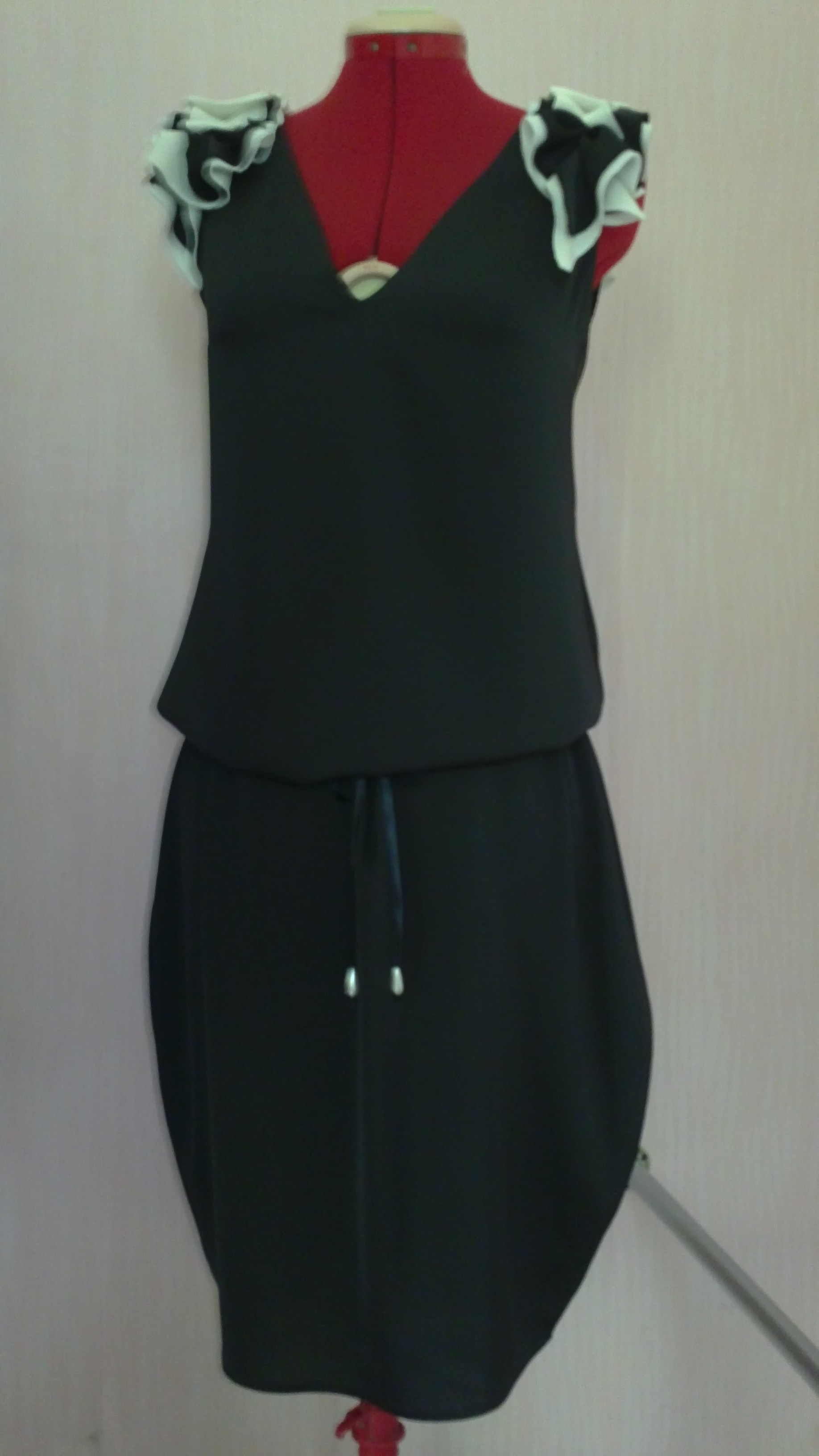 Изначально шилось платье длинное в пол,с "ушами" в районе колен,и такими лентами контрасного цвета.Шилось кстати в один день!На примерке клиентка,девушка невысокого роста жутко расстроилась-она была уверенна,что такая модель ей пойдёт!Тут же мы решили сделать длину чуть ниже колен и кулиску на бёдрах.Таких "ушей" уже не было,но нам определённо больше понравился конечный результат.Ленты на плечах собрались в "безобразие" и все были довольны!Ткань-струящийся мокрый шелк.