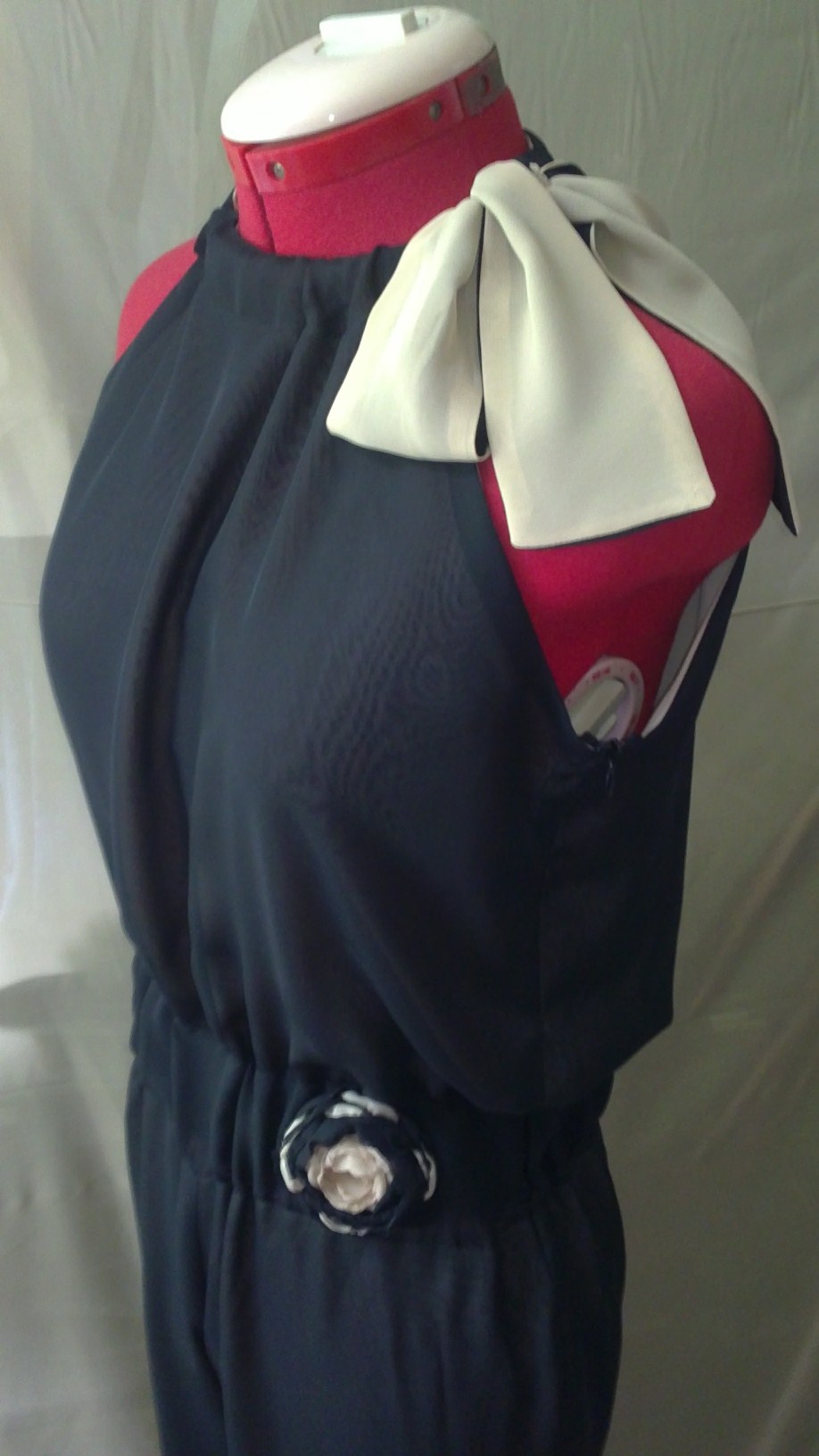 Шифоновый комбинезон,в два слоя:черный и телесный.Отрезной по талии,пояс шириной 10 см.Поясок-лента просто втягивается...