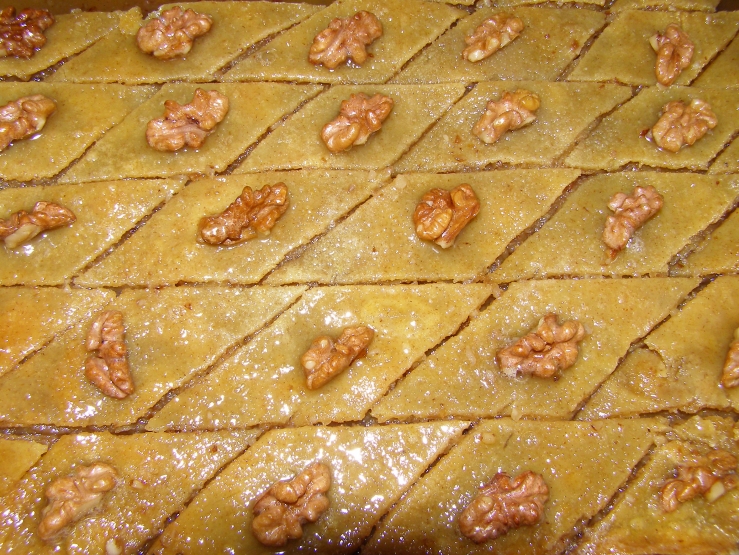 salifa Опубликовано 24 июня, 2009 Поделиться #1 Опубликовано 24 июня, 2009 (изменено) Увлеклась я восточными сладостями. Продукты все есть у нас, а не готовим мы так, совсем другая у нас выпечка! Пока учусь, и буду рада, если поделитесь как готовить восточную выпечку.Вдохновила сьемка Юлии Высоцкой в Баку, где они готовили пахлаву. Ее и сделала, немного изменив рецепт (у них сахара в дрожжевом тесте нет, а без него дрожжи плохо поднимаються, нечему бродить). Блюдо вкусное и очень каллорийное, готовиться довольно сложно, лучше вдвоем делать - один раскатывает листы, второй посыпает. (фото из сети, свои не успела сделать, но выглядит так же)Начинка: Грецкие (миндальные, или смесь их) орехи измельчить в блендере (мелко и однородно), 1 часть орехов, 2 части сахарного песка, щепотка кардамона. Можно анис, кориандр - я не добавляла.Тесто: 0,5 кг муки, 2 ст.л. сахара, 100 г сливочного масла (натереть на терке и дать постоять), два яйца, 0,5 л молока, 30г дрожжей, соль, шафран (заменила куркумой для цвета). Дрожжи развести в теплом молоке, добавить сахар, 2 ст.л муки. Дать постоять мин15-30 (до поднятия опары). Добавить щепотку соли, шафран, яйца, масло, муку. Вымесить, тесто получаеться эластичное и мягкое (не крутое). Поднимаеться колоко 2-3 часов.Противень смазать растительным маслом, тесто делим на 7-10 частей, раскатываем по максимуму тонкие пласты. На противень - лист теста, плотно посыпать орехами с сахаром, тесто - начинка-тесто, верх смазать взбитым яйцом. Печь 10 мин в горячей духовке при 180. Вынуть, быстренько порезать ромбики, уткнуть орешки сверху, залить топленым сливочным маслом до краев(если его нет - рафинированным подсолнечным), масло все впитаеться. Выпекать около 1 часа.Дальше можно не делать, и так вкусно - можно полить растопленным медом. Изменено 24 июня, 2009 пользователем salifa Самое важное в женской одежде – женщина, которая ее носит. (Ив Сен-Лоран) Ссылка на сообщение Поделиться на другие сайты Поделиться