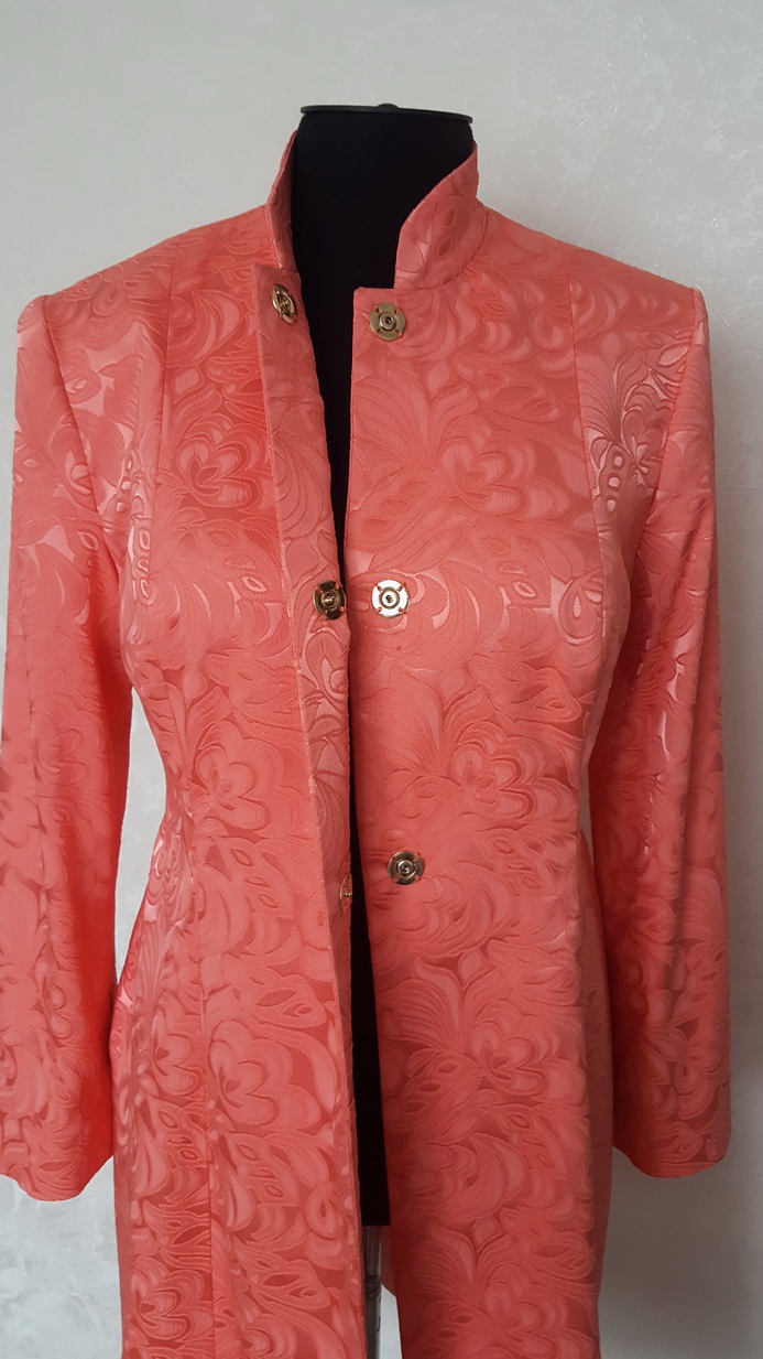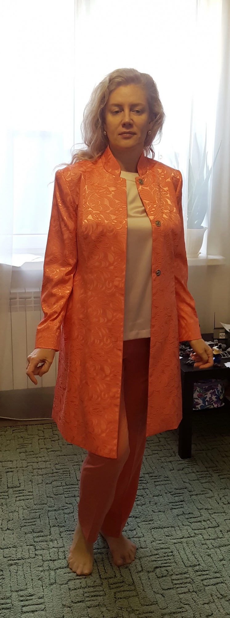 OmeLa Опубликовано 2 мая, 2020 Автор Поделиться #2486 Опубликовано 2 мая, 2020 Я с новым показом.Это капсульный заказ. Небольшая капсула.Это наряд для мамы невесты. Выход планируется в трех образах.В этот раз я не участвовала в закупке ткани. Это полностью заслуга клиентки. Был выбран корраловых оттенков цветовое направление. Жакет-тренч.Очень приятный глазу, и даже светотерапия, жаккард с односторонним принтом и изумительного качества, послушный во всем. Шилось масло масленное. Жакет у нас классический, приталеный, рельефы вдоль, на стойке, с застежкой на кнопки и разрезы по бокам от бедра. Подклад шелк, он капризуля, но усмирен. Конечно же пришлось подбирать рисунок, отменно поиграла в пасьянс. Пришлось на это большего расхода ткани. Рисунок удалось сцентрировать по застежке.Клиентка поклонница восточного стила в гардеробе, поэтому мы ввели разрезы по бокам.При всей простате жакет шила долго, подгоняя каждый узел стыкуя шелк ползучий и жаккард. Главное не то что хочешь, не то что делаешь, а то что получаешь в итоге. Ссылка на сообщение Поделиться на другие сайты Поделиться