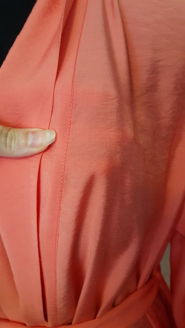 OmeLa Опубликовано 31 марта, 2020 Автор Поделиться #2481 Опубликовано 31 марта, 2020 Ну и еще интерестностей покажу.Платье-облипочка. На вид так очень облипочка. Ткань принесенная, тоже долго думанная на что применить. Плюсы конечно же в цвете, блестит сатиново, дальше начинаются минусы. Вроде трикотаж но больше к синтетике, растяжение упругое, аж до компрессионности. Вроде не тонкая но пропечатывает все. От тяжести провисает. Фасон должен быть очень продуманным. Года два на него заходили все же уговорили меня на платье. Основа как на трикотажку, с минусовкой на растяжение. После первой примерке решение было резать по талии, конечно же без выточек излишек весь в складках. Прогиб по спинке резкий , бочки аж дугообразные. Змейку укоротила всего на 4см на юбочной части. Подвороты рукава подшиты в шов и прихвачено на двух точках ниткой, не подлезть. Открытая спинка до линии бюстика. Планка слегка под натяжением для прилегания. Так же лодочка по переду. Тем же методом что и выше, только здесь в оборот и на выворот стачивала плечевой шов. Даже оверложить не стала чтоб не толщить. Главное не то что хочешь, не то что делаешь, а то что получаешь в итоге. Ссылка на сообщение Поделиться на другие сайты Поделиться