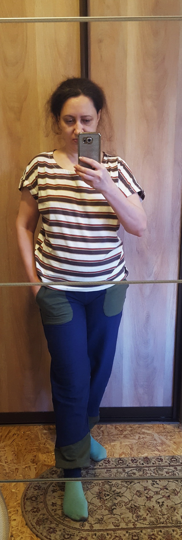 OmeLa Опубликовано 2 мая, 2020 Автор Поделиться #2488 Опубликовано 2 мая, 2020 А теперь свое покажу.Тут в таверне показывала, свои брючки-кюлоты. Теперь здесь надо показать.Очень сомневалась в ширине брючин, но все же оставила как есть. И бац зашли все подомам, так никуда и не выгуляла(((( очень понравились здесь кармашки. Ну а пока сидим, одежка домашняя прохудилась, пришлось себе из остатков чего только осталось пошить домашний гардеробчик. Майка и штанцы на манжете, что очень люблю особенно в дворово-огородний сезон. Даже моим мальчикам по трусишкам сотворила. Не фоткала но выкройку нашла отличную, делюсь. Шьются быстрей чем девочкам слипики. Единственно что заявленная в чертеже 26см ОБ все же многовато. Мои 106-110 бегемотам пришлось немного убавить. Расчет растяжимости обязательно взвесить надо. И для пузика лучше по переду чуточку убрать . Главное не то что хочешь, не то что делаешь, а то что получаешь в итоге. Ссылка на сообщение Поделиться на другие сайты Поделиться