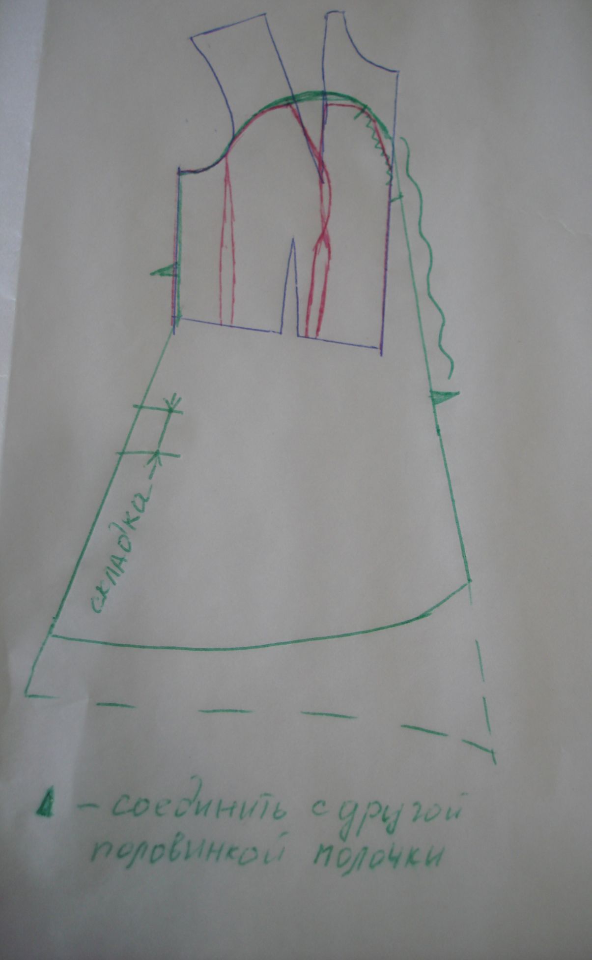 OmeLa Опубликовано 23 июня, 2011 Автор Поделиться #743 Опубликовано 23 июня, 2011 Обещанные подробности к зеленому платью.Платье двухслойное. Нижнее - приталенного силуэта без талиевых выточек. Верхнее - спинка аналогично нижнему, перед .... т.к у нас прошли изминения в фасоне то по очередности..... Выкройку взяла с того же корсета, прибавка по верху 1см,в области талии просто плавная линия переходящая в юбку, клешение юбки ок. 6см. Перед - совместила выточку лифа по верху + 1см приб., линию бокового шва сместила в сторону полочки, удлинила линию декольте на драпировку 18см. Долевая пришлась на линию середины переда. Косая пришлась на нижнюю боковую часть юбки, её то и повело, отвис в итоге составил больше 12см. Верхняя юбка короче нижней на 5см, выкраивала одной длины, но из-за отвисов и того что нет времени на дальнейшую возню с выравниванием низа, сделала сзади небольшой хвостик вровен с нижней юбкой. как раз к передним неровному краю.На фото ( извините нарисовано от руки, но зато с чертежного рисунка) Основа -синяя, красная линия -корсет, зеленая - платье ( !)) я не специально, что было под руки тем и нарисовала))) А теперь как и что получилось . Видя что драпировка не ложится , после приступа Караул все пропало! я методом наколки стала подкалывать отвисшие углы платья перекладывать их туда сюда и поиграла с образовавшейся качелькой. Складки зашиты на уровне бедер, отлетные части отмерила нужное состояние провисания, сложила уголочек и подшила на уровень талии, Одна часть нашита к боковому шву, а другая вшита между передом и спинки тем же уголком, качель и хвостик в свободном движении. На примерки уточнили точное их положение. на лиф сделала обратный нахлест край подветнула на 2см. Край юбок по косой оттянула утюгом и отстрочила в край.Когда отдавала платье не очень понравился как сидит лиф на одной груди, идет залом, думала все косяк, приплыли))) и тут меня поставили в известность что присутствует разный объем и асимметрия грудных желез. :-0 (...а я все на себя все время пинала, что не могу точно поставить чашки). На примерках получается был один период цикла, а когда забирали платье естественный, извините за такие интимные подробности, но в нашем шитейном деле оказалось без них нельзя. Теперь у своих клиенток буду снимать не только мерки но и спрашивать календарь женского цикла.......... Как всегда вышла из положения - железной спиральной косточкой, это хорошо что они у меня лежат. Распорола подклад и поставила в нужную грудь, благо были кулиски, прям в нужный натяг получилось. Добавлю одно такое платье пойдет не всем типам фигур. На фигуры с выраженными бедрами и талией этот вариант может и не быть хорошо........все остальное описывала выше, повторяться нет смысла ;-) ========================Милые девушки-рукодельницы что хочу вам сказать и посоветовать лично, НИКОГДА не беритесь за срочные заказы, тем более менее чем за 10 дней!! вам это будет дороже в первую очередь нервами, ночными работами и не всегда они оправдают себя в заработке. Главное не то что хочешь, не то что делаешь, а то что получаешь в итоге. Ссылка на сообщение Поделиться на другие сайты Поделиться