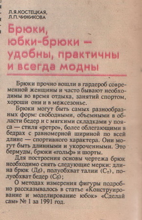 Мята Опубликовано 7 ноября, 2009 Поделиться #278 Опубликовано 7 ноября, 2009 Добро, я согласна держать вас в курсе. Только дама редко ходит, могут быть большие перерывы. Я сравнила старую и новую выкройку. Высота сидения в старой выкройке я делала расчётную, в новой она стала глубже на 2см. Но заказчица жаловалась, что штаны провисают между ног. Возможно это зависит от общего построения. Ещё по спинке на уровне талии центральный шов сместился на 1,5см в сторону бокового шва. Построение выкройки у меня из журнала "Сделай сам", могу выложить прямо здесь, но туда я тоже внесла свои поправки. Я тоже перепробовала кучу разных способов построения, этот больше понравился. Этим построением пользуюсь давно, номер журнала был издан 1992 году, Мюллера тогда не было у меня. И ещё - это построение рассчитано на складки по л. талии, как брюки "банан". Внесла кое какие изменения. 1. высоту сидения замеряю 2. делаю скос по л. талии по передней половинке 0,5-1 см 3. от л. сидения поднимаюсь на 6 см и л. банта строю от т.6, но только по передней половинке. 4. вместо склад на талии пересчитываю и делаю вытачки Не запрещай себе творить.. Пусть,иногда выходит-криво... Твои нелепые мотивы,никто- не сможет повторить!!! Ссылка на сообщение Поделиться на другие сайты Поделиться