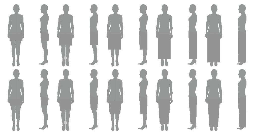 Natamoda Опубликовано 13 октября, 2008 Поделиться #728 Опубликовано 13 октября, 2008 Есть ещё путь по созданию моделей. Самостоятельно найти силуэты, не смотря в журналы. Так надо поступать, когда надо создать что-то своё. Чем больше силуэтов прорисовано, тем больше выбора для одного единственного, неповторимого.Но начнём с самого обычного - поиска длины юбок и брюк. Решаем, что верх будет при этом прилегающий, с минимальным объёмом. Для эксперимента возьмём 4 фигуруGecuba рост=164, ОГ = 90, ОТ = 69, ОБ = 93 Здесь вариант совсем прямого низа и зауженного и выбираем, что больше всего нам нравитсяПопробуем расширить низ на конус и сделать низ с членениями по объёмуТаких проб можно делать бесконечное количество. Их я делала в автокаде, здесь у меня получается быстрее, чем в фотошопеМожно делать и фантазийные силуэты, перемещая объём то к верхней части туловища, то к нижней, то увеличивая объём, то уменьшая. И так до бесконечности.Gecuba, как-нибудь отметьте силуэт, с которым буду работать дальше. Мой блог 3Д лекала дистанционно Ссылка на сообщение Поделиться на другие сайты Поделиться