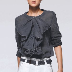 Очень интересная находка, такой романтичный волан в сочитании с графитовым угольным оттенком блузы, и еще усугубляется "грубостью" необработанных краев. Здорово!