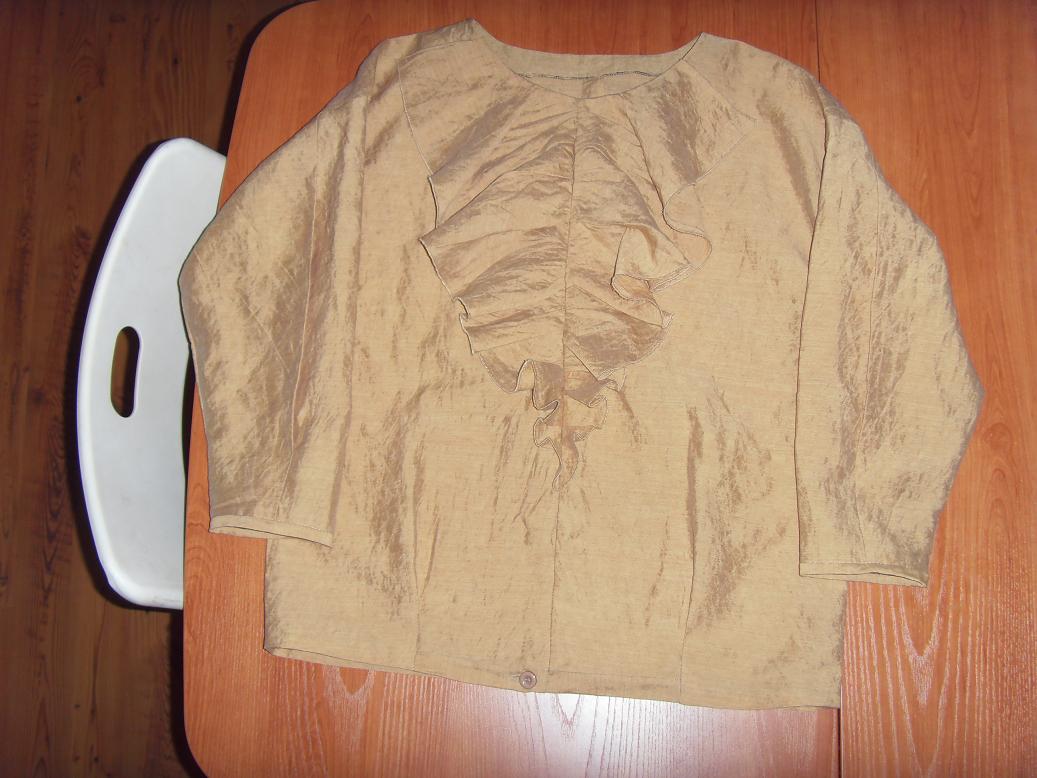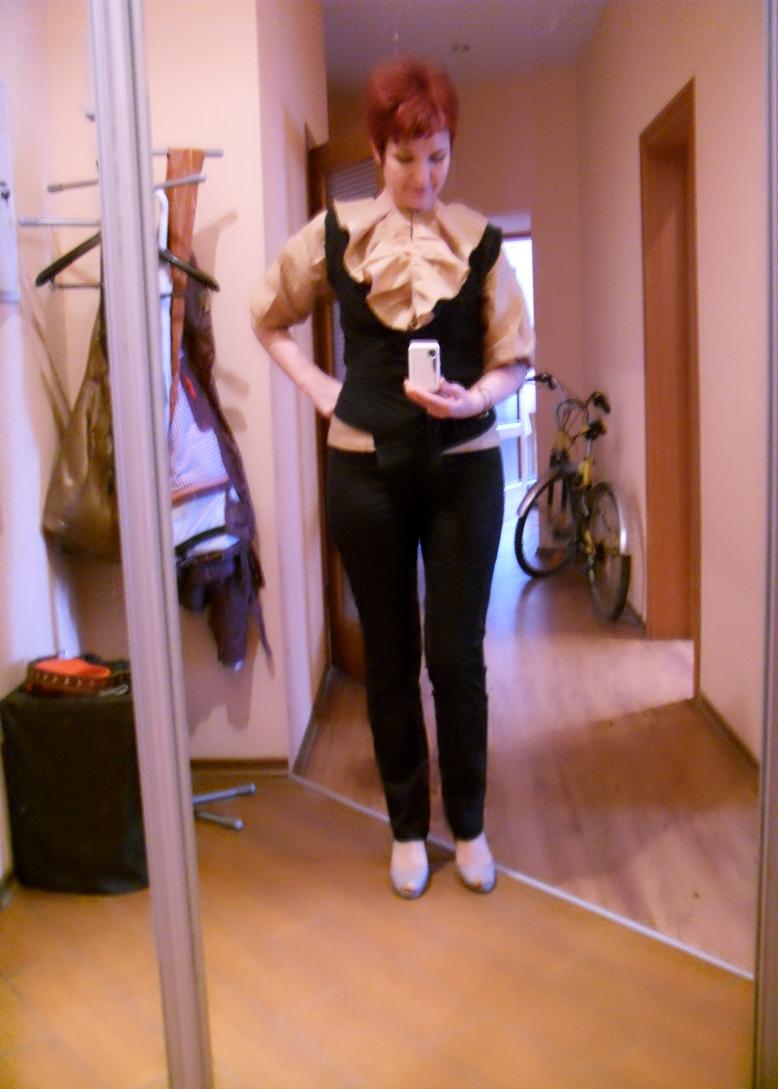 Ну вот еще один выходной и блузон готов. К нему и брюки черные. Шила по той же выкройке из бурды, что и серые брюки, только ткань не шерсть, а хлопок-стрейч, к короткому северному лету. Блузоном очень довольна. Рукав с двумя складками, когда поднимаешь на локоть, получается такой пышный фонарик. Застежку на вороте сделала внутреннюю, маленькая пуговка и ниточная петля, поэтому можно применять любую бижутерию. Внизу тоненькая манжета, защипы, за счет чего получается легкий напуск. Модель брала из бурды 8/09, но жабо переделывала. Ткань на самом деле золотистая, а не матовая.