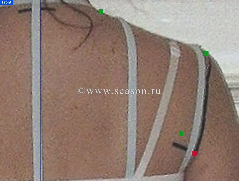 Zvezdopad Опубликовано 21 марта, 2010 Автор Поделиться #66 Опубликовано 21 марта, 2010 пройма ух..и наковырялась же ;-) Пройму надо сориентировать. А то она у нас зависнет посреди манекена.Скопируем со слоя obvod осевую линию,линию проймы и контрольные точки проймы с обоих видов : спереди и сбоку.Должны скопироваться по 4 точки с каждого вида, верхняя плечевая, нижняя точка проймы и две боковыеПосле того как скопируем, будем находить эти точки в пространстве пересечением двух линий на виде ТорЧто делаем... Чтобы не запутаться в точках, будем оставлять видимыми по две парные точки, а остальные на время скрывать.. Сейчас скроем все точки кроме точек верхнего угла подмышечной впадины на виде спереди и сбоку. После этого переходим в окно Тор, включаем привязку к точкам и рисуем две пересекающие линии из этих точек. Теперь включаем опять все точки, находим следующую пару точек, остальные скрываем и проделываем то-же самое... и так нужно проделать с каждой парой точек четыре раза. единственный способ жить хорошо - сразу уходить оттуда, где плохомой канал на YouTube, мой instagram, моя страница ВК Ссылка на сообщение Поделиться на другие сайты Поделиться