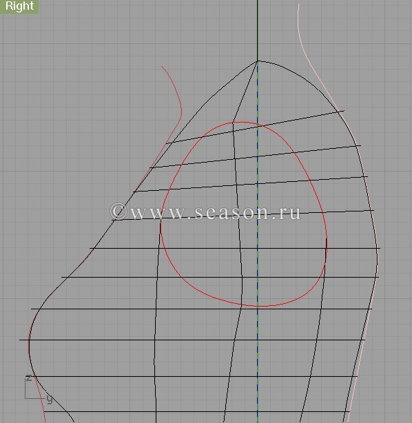 Zvezdopad Опубликовано 15 марта, 2010 Автор Поделиться #57 Опубликовано 15 марта, 2010 Ну, вот, отгуляли-отшумели выходные, пора браться за серьёзное дело - обводку и нахождение боковой линии. Обводка бока на фото в фас Начинаем под ухом, проходя до подмышечной впадины, и тут включаем второй слой - с разведёными руками ( тут вот нам и пригодилось это фото)Так же потом правим и ровняем эту кривую, как описано в предыдущих постах: инструментами Rebuild Curves Non Uniform и Curve: Interpolate PointsКривая должна проходить через контрольные точки: точку основания шеи и конечную плечевую точку ( кривая красного цвета и на виде сбоку эта линия тоже красная, выглядит, как прямая) И вот эту фотографию, давайте рассмотрим внимательно.Все лишние линии я пока спрятала при помощи лампочки.Кстати...вы с лампочкой-то на верхней панели разобрались? С серенькой такой лампочкой?Если нет - пишите, сделаем путешествие по лампочке. Боковая линия Я оставила на этом фото в профиль два рельефа - передний боковой и задний боковой, они ярким цветом ( голубым?) , ну в общем, яркий бирюзовый цвет. Где должна пройти наша линия бока?Она должна по логике пройти по центру между этими двумя рельефами. Вот давайте её и нарисуем. Призовём на помощь этот инструмент Этот инструмент рисует линию равноудалённую от обеих кривых по центру между этими кривыми. ЛК клик на , выделяем ОБЕ кривые бирюзового цвета:командная строка вам в это время подсказала : выделите первую кривую, потом ещё подсказака: выделите вторую кривуюи нарисовалась линия зелёного (у меня) цвета между двумя этими кривыми. Ну, ведь волшебство, да и только:-) Теперь надо нарисовать нашу линию бока от кончика уха, через контрольную точку шеи, затем конечную плечевую точку и пройти вдоль всей нашей зелененькой вспомогательной линии.Берём инструмент , да, всё тот же наш инструмент, которым мы рисуем кривые на плоскости, и рисуем нашу линию Дойдя до вспомогательной боковой линии включаем привязку Near (привязка к кривой) И вот тут начинается самое интересное!Наша линия начинает притягиваться к впомогательной кривой и ложится ровнехонько по ней... Так мы и дорисовываем нашу линию до самого низа... А затем просто удаляем вспомогательную линию.... она больше не нужна, свою задачу она уже отработала.... Не знаю, понятно-ли я это объяснила, но я попробовала , и у меня получилось! Вероятнее всего именно здесь работает близость расположения двух линий, и когда мы включили привязку Near в нужном месте, кривые слились в одну. Это станет видно лишь после того, как вся операция закончена. Всё! Наша линия бока готова!Мы сделали это:-) единственный способ жить хорошо - сразу уходить оттуда, где плохомой канал на YouTube, мой instagram, моя страница ВК Ссылка на сообщение Поделиться на другие сайты Поделиться