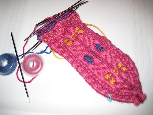 Нафиса_РФ Опубликовано 10 февраля, 2010 Поделиться #137 Опубликовано 10 февраля, 2010 (изменено) www.knitty.com есть хорошие картинки 3 вида как начинать с мыска http://knitty.com/ISSUEwinter02/FEATtiptoptoes.html из 3 предложенных вариантов легче всего figure-eight toe Перевод приложуМысок восьмеркамиЭтот вид мыска может казаться очень хитрым в начале, но при небольшой практике, Вы можете научиться этому. Вам не нужен временный набор петель.. Вы начинаете пряжей для носка и продолжаете ей! Возьмите 2 из ваших спиц и оберните нить вокруг них в виде цифры восемь: Вы можете набирать 8 петель на каждую спицу, как здесьИспользуя третью спицу, провяжите 8 петель на главной спице : Используя четвертую спицу, провяжите петли на нижней спице.Как и на верхней спице, петли будут перекручены, поэтому не забывайте провязывать за задние нити, когда вяжете провязываете скрещенную петлю. Повторите последние 2 ряда, так, чтобы у вас оказалось законченными 4 ряда. У вас получится спица наверху вашей работы с 8 петлями на ней, и спица в низу вашей работы с 8 петлями на ней: Петли в середине вашей работы могут быть свободными, но Вы можете стянуть их немного, подтянув лишнюю пряжа с одной стороны после того, как Вы закончите несколько рядов. Начните вязать по кругу. Круг 1: Наберите 1 петлю в начале круга, провяжите 4. Эти петли продолжатся на спице 4. Отметьте следующую петлю как начало вашего круга. Используя другую спицу, провяжите 4, наберите 1. Это - спица 1. Используйте третью спицу, наберите 1, провяжите 4 петли [Спица 2] затем возьмите четвертую спицу, чтобы провязать 4, набрать 1 [Спица 3]. Провяжите 5 петель на спице 4. Вы теперь имеете спицы с 5 петлями на каждой.Начните работать чулочной вязкой, увеличивающем следующим образом:Круг 1: Вязание Круг 2: Н-наберите, В-вяжите.Спица 1: Вязание до последней петли, Н1, В1Спица 2: Вяжите 1, Н1, вяжите до концаСпица 3: Вязание до последней петли, Н1, В1Спица 4: Вяжите 1, Н1, вяжите до конца Повторяйте эти 2 круга, пока у Вас не будет по 12 петель на каждой спице [48 –общее количество петель]. Мысок готов! Не обязательно набирать восемь. Турецкий чаще всего 4. Но принцип тот же и узор начинается с того же ряда, где начинаются прибавки Изменено 10 февраля, 2010 пользователем Нафиса_РФ Ссылка на сообщение Поделиться на другие сайты Поделиться