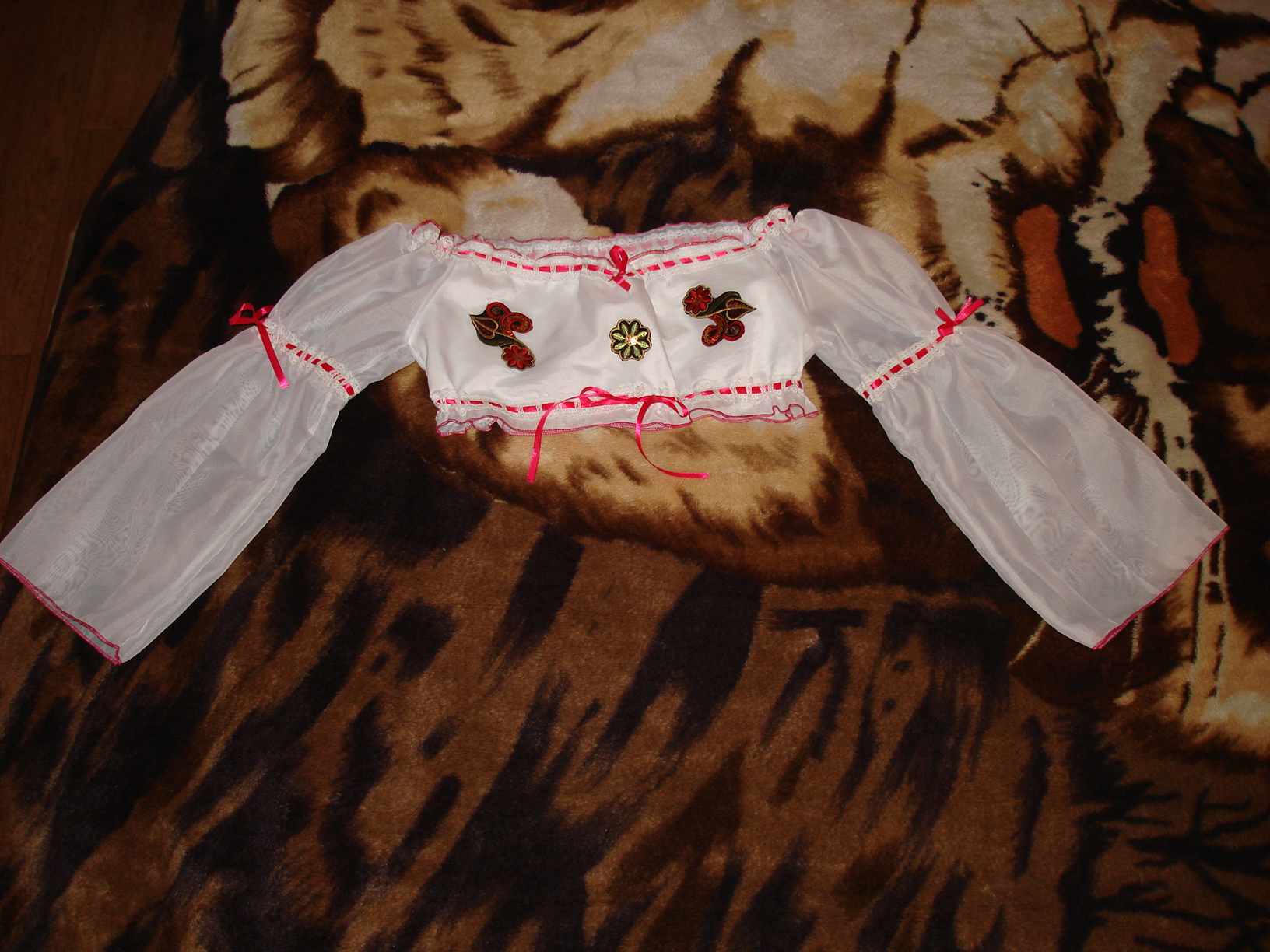 на счет аппликации!!! Как я поняла эти мотивы просто были прицеплены для консультации. По этому их в расчет и не брала. Они действительно тут лишние. Понимаю, что костюм бюджетны, и сильные переделки тут делать не будут. Знаю это точно т.к. сама такие выдаю на гора. А вообще под какую музыку танец? Может там и мудрить ничего не нужно.