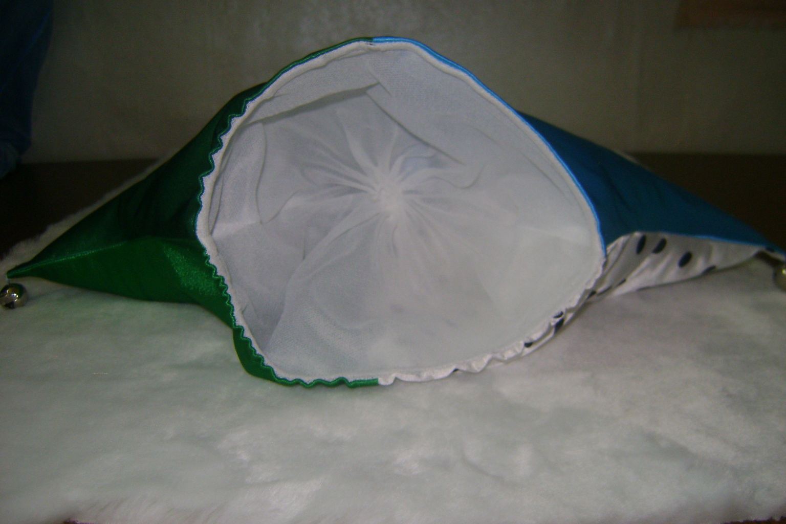 Теперь о шапочке - выкройки нет кроила "на глаз" ведь это петрушка, чем смешнее, тем лучше. Околышек -длина - обхват головы плюс пару см, чтобы свободненько было (потом сзади вставим 5 см широкой резинки; ширина в готовом виде см 6, у нас получилась широковато, поэтому мы складывали напополам на фотке видно. Клинья 5 шт. (можно 6) основание клина - длина околыша : на количество клиньев плюс по 0,5 см с каждой стороны на швы. Длина клина бала примерно на несколько см меньше чем длина от лба до основания черпа минус ширина околыша в готовом виде (шапочка облегает голову неплотно).