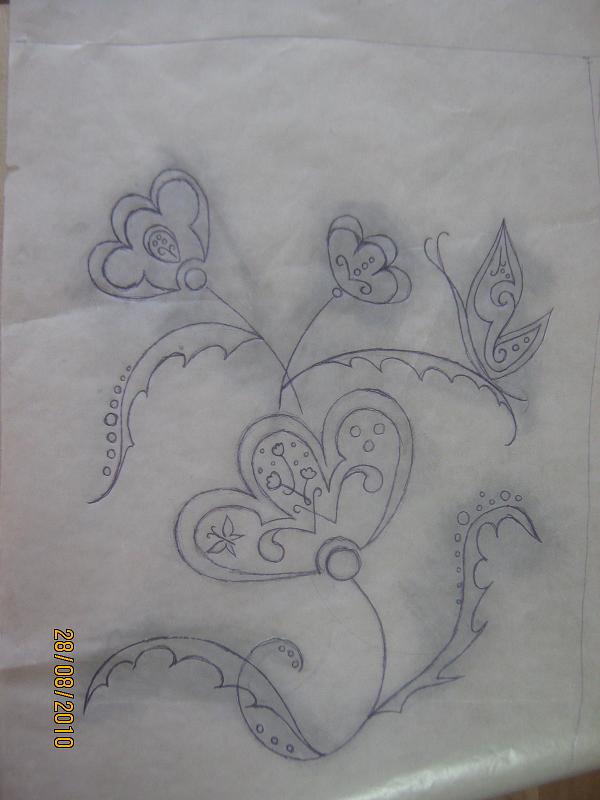 *Намазала обратную сторону кальки косметическим карандашом серебристого цвета (уж что нашла =))) - получилась копирка, перенесла рисунок на ткань.