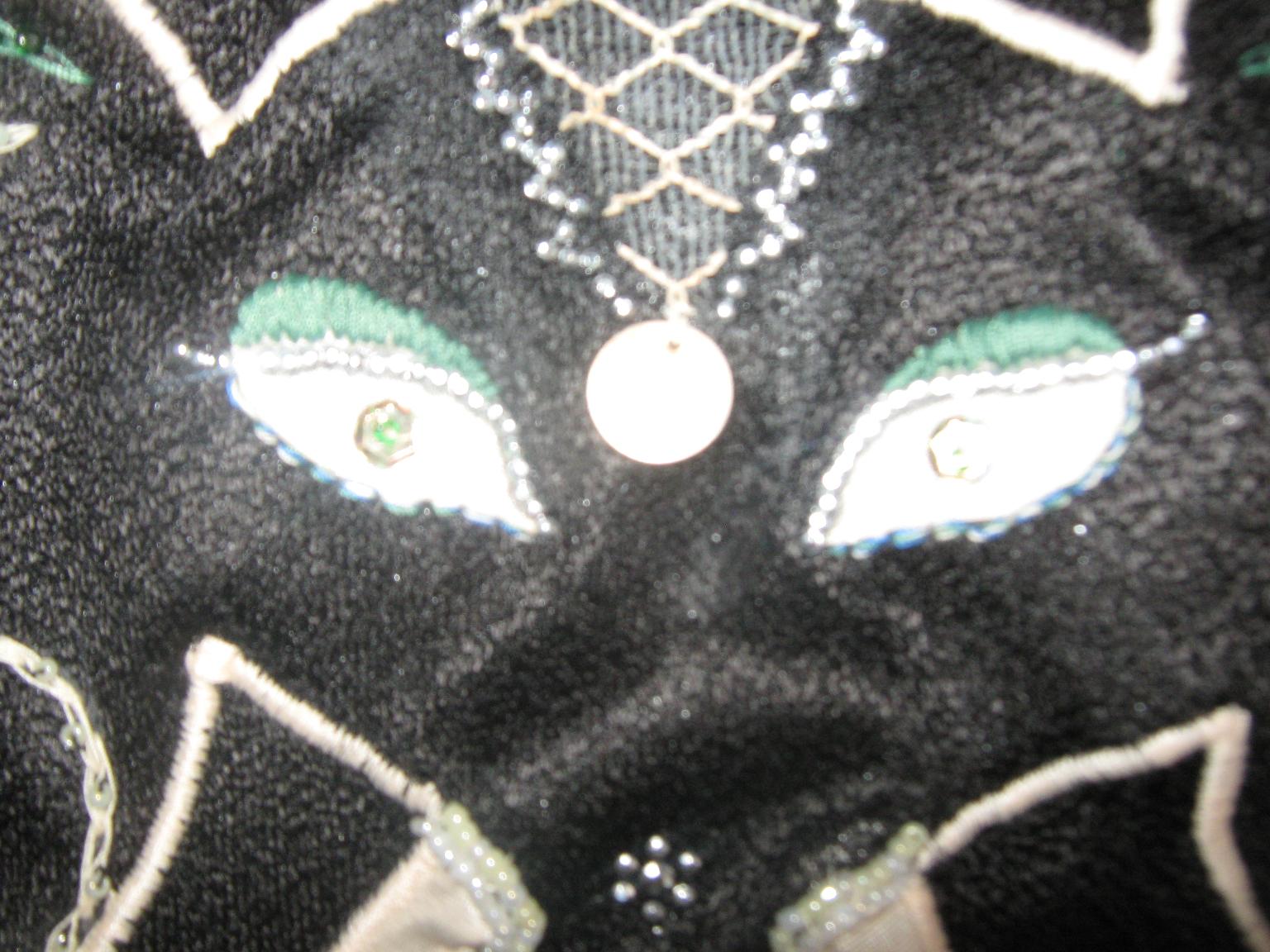 Глаза - изнаночная сторона атласа, пайетки, бисер, веки "закрасила" зелёной нитью в 4 сложения, реснички - термостразы под металл.
